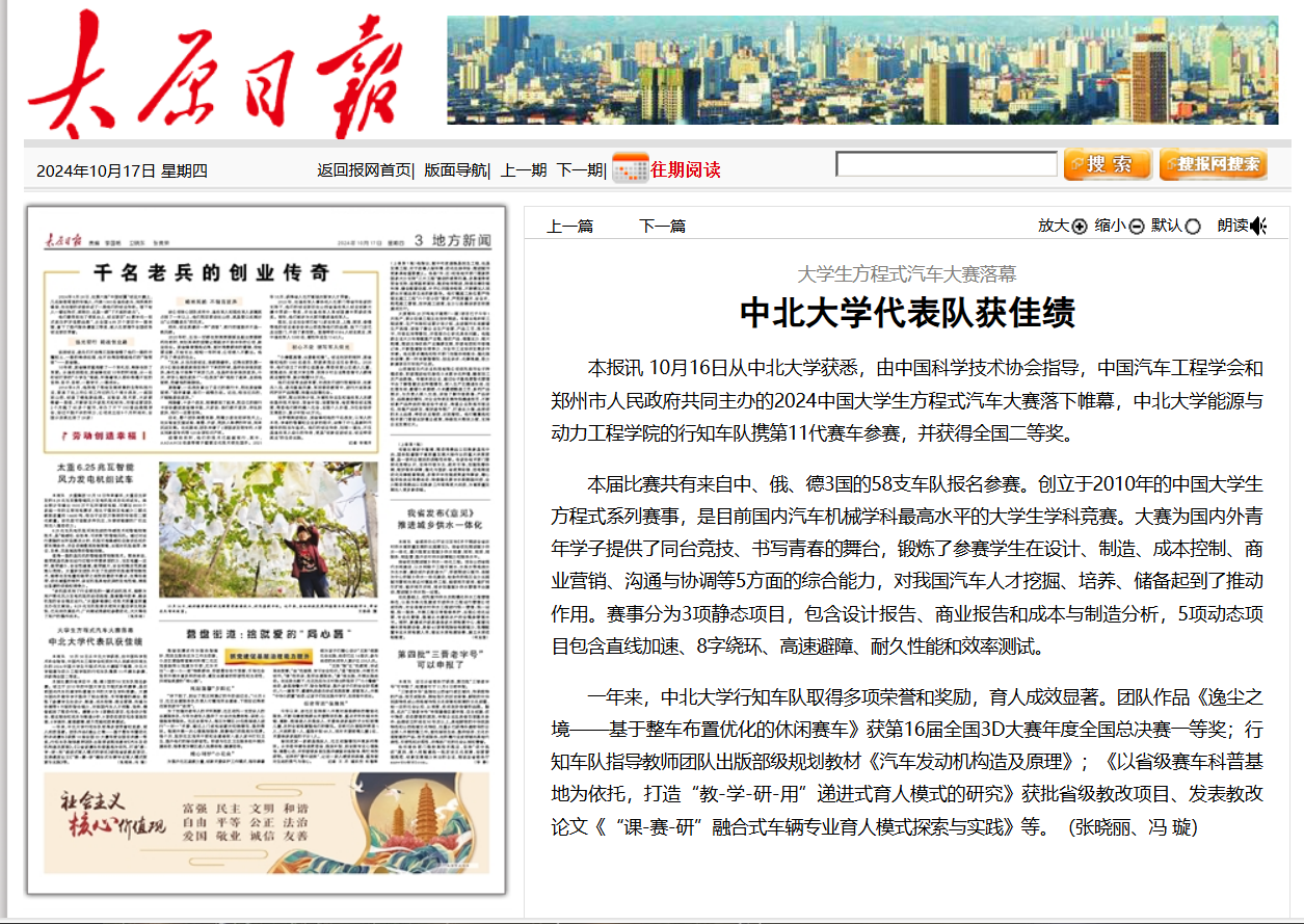 10月16日从中北大学获悉,由中国科学技术协会指导,中国汽车工程学会和郑州市人民政府共同主办的2024中国大学生方程式汽车大赛落下帷幕,中北大学能源与动力工程学院的行知车队携第11代赛车参赛,并获得全国二等奖。