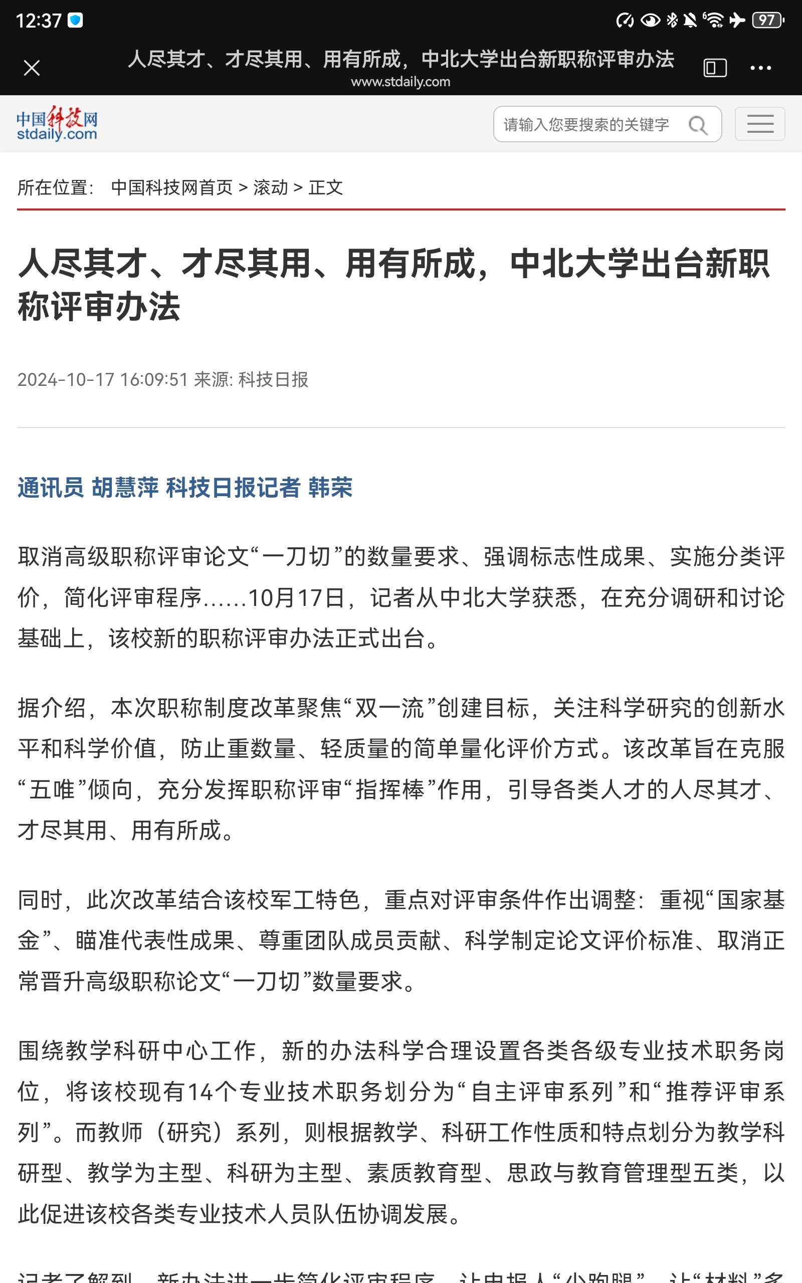 取消高级职称评审论文“一刀切”的数量要求、强调标志性成果、实施分类评价,简化评审程序……10月17日,记者从中北大学获悉,在充分调研和讨论基础上,该校新的职称评审办法正式出台。