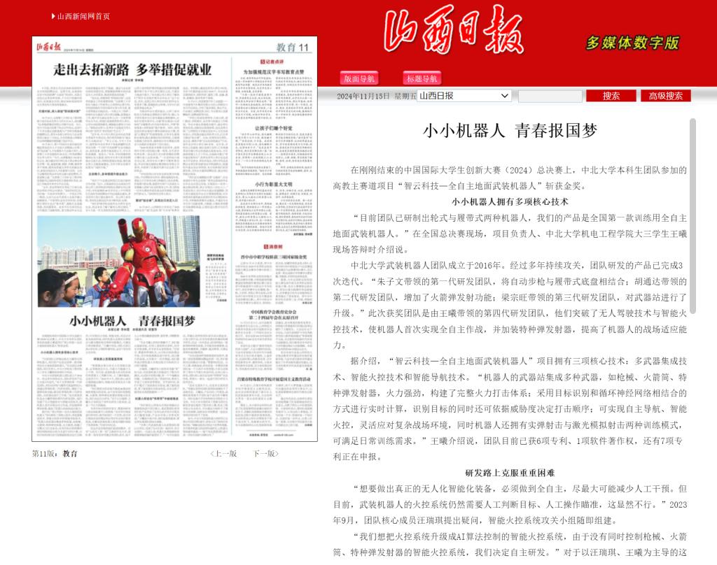 在刚刚结束的中国国际大学生创新大赛(2024)总决赛上,中北大学本科生团队参加的高教主赛道项目“智云科技—全自主地面武装机器人”斩获金奖。