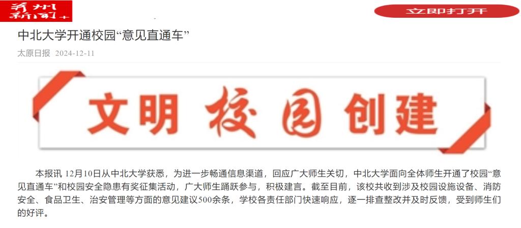 本报讯 12月10日从中北大学获悉,为进一步畅通信息渠道,回应广大师生关切,中北大学面向全体师生开通了校园“意见直通车”和校园安全隐患有奖征集活动,广大师生踊跃参与,积极建言。截至目前,该校共收到涉及校园设施设备、消防安全、食品卫生、治安管理等方面的意见建议500余条,学校各责任部门快速响应,逐一排查整改并及时反馈,受到师生们的好评。