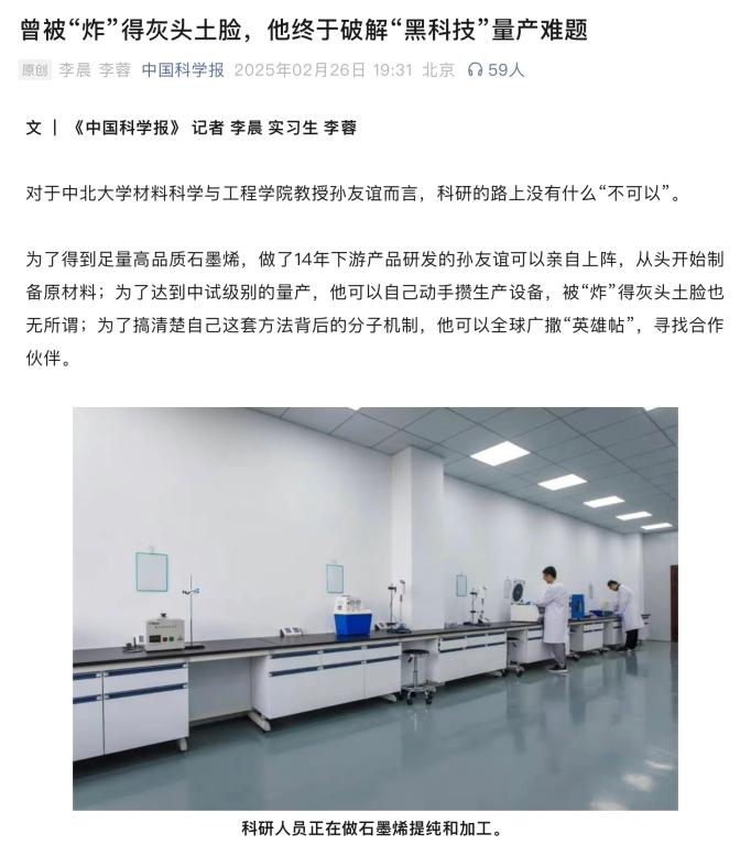 2011年,孙友谊正在北京大学做博士后研究。一位西班牙材料学家和孙友谊博士后期间的指导老师都提到,石墨烯研究将在科学界“粉墨登场”,备受瞩目,未来还将在产业界大有作为。当时国内科研团队跃跃欲试,纷纷投身石墨烯研究领域。