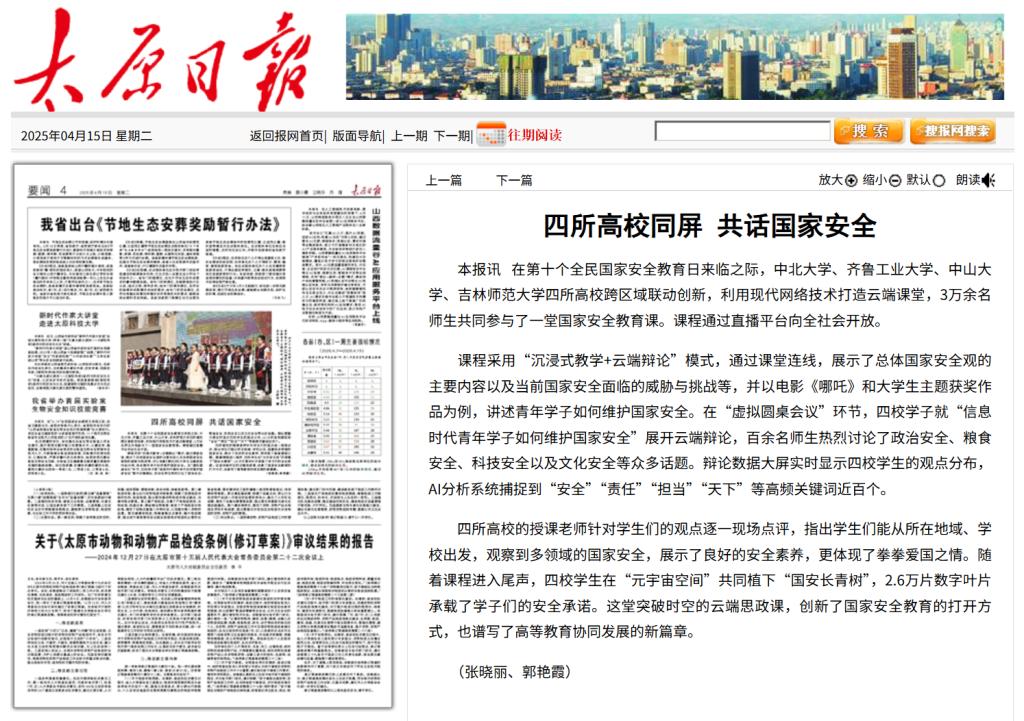 本报讯 在第十个全民国家安全教育日来临之际,中北大学、齐鲁工业大学、中山大学、吉林师范大学四所高校跨区域联动创新,利用现代网络技术打造云端课堂,3万余名师生共同参与了一堂国家安全教育课。课程通过直播平台向全社会开放。