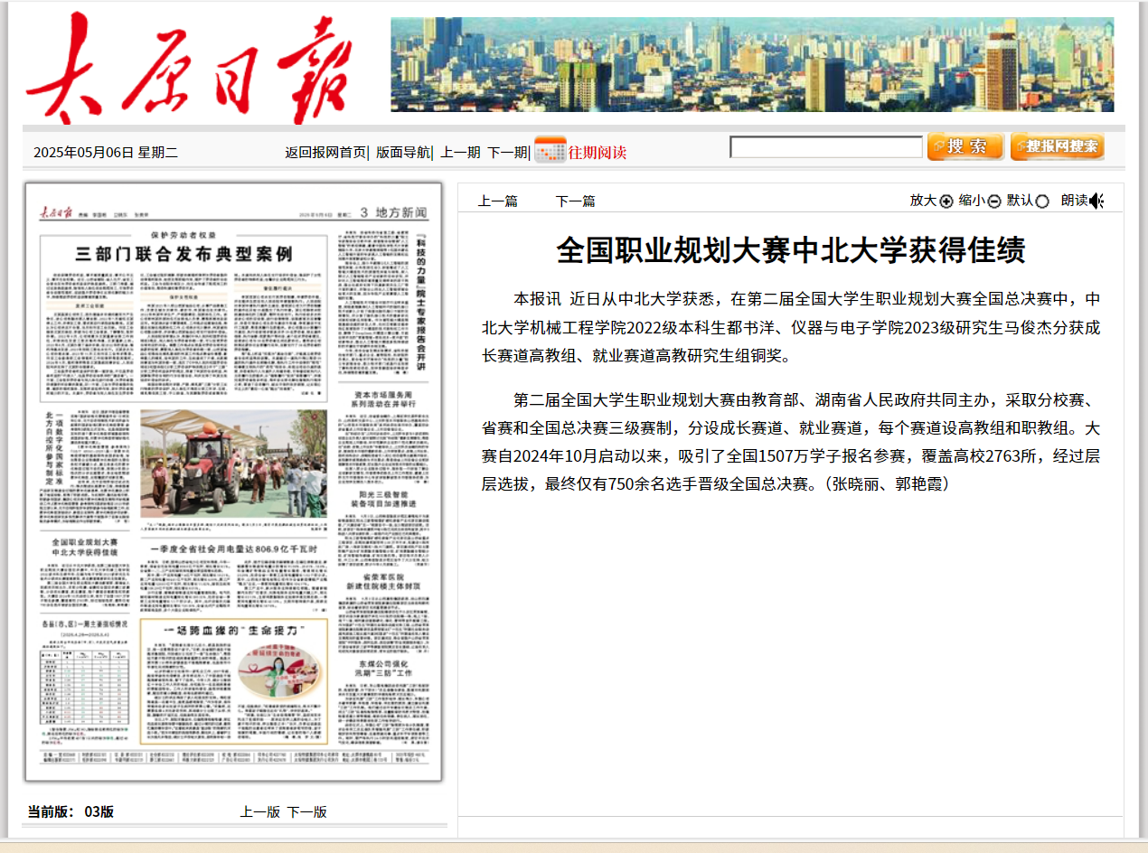 本报讯 近日从中北大学获悉,在第二届全国大学生职业规划大赛全国总决赛中,中北大学机械工程学院2022级本科生都书洋、仪器与电子学院2023级研究生马俊杰分获成长赛道高教组、就业赛道高教研究生组铜奖。