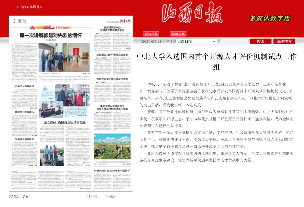 本报讯(记者李林霞 通讯员胡慧萍)记者4月30日从中北大学获悉,工业和信息化部、教育部与开放原子开源基金会日前在北京联合发布国内首个开源人才评价机制试点工作组名单,共有5家工业和信息化部部属单位和20家知名高校入选,中北大学凭借在开源领域的突出贡献,成为我省唯一入选高校。