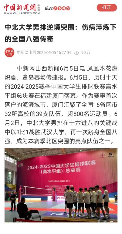 中新网山西新闻6月5日电 凤凰木花燃炽夏,鹭岛赛场传捷报。6月5日,历时十天的2024-2025赛季中国大学生排球联赛高水平组总决赛在福建厦门落幕。作为赛事首次落户的海滨城市,厦门汇聚了全国16省区市32所高校的39支队伍、超800名运动员。6月2日,中北大学男排在十六进八的关键战中以3比1战胜武汉大学,再一次跻身全国八强,成为本赛季北区突围的亮点队伍之一。