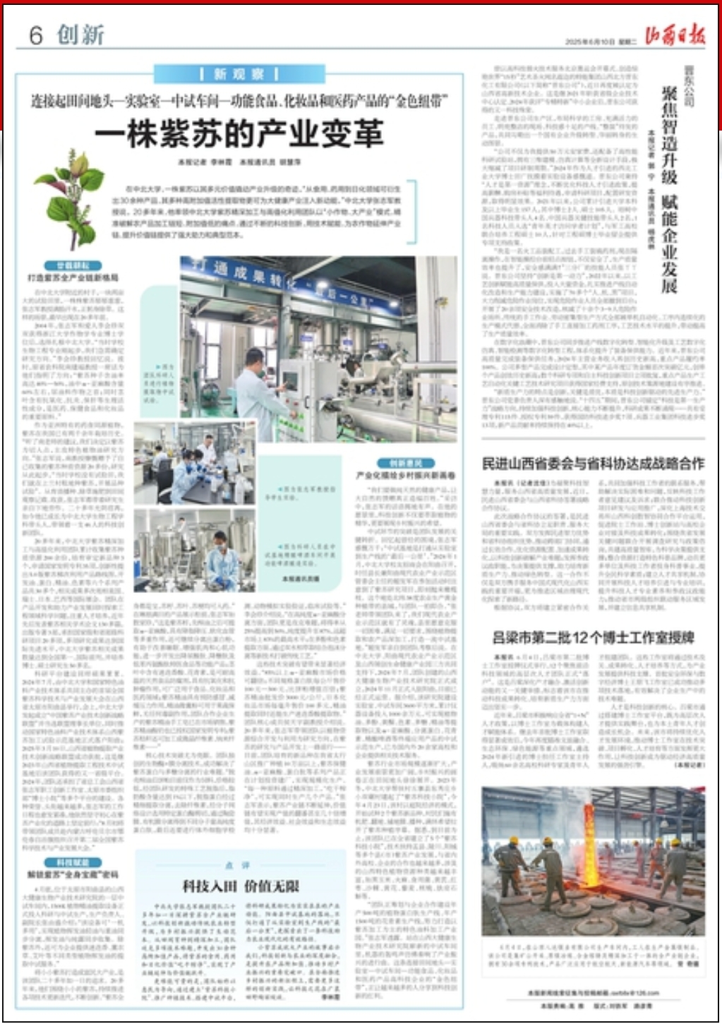 更难能可贵的是,团队始终以惠民为导向,通过建立“紫苏科技小院”、推广种植技术、搭建中试平台,将科研成果转化为实实在在的产业动能。阳曲县中试基地的落地,不仅打通了从实验室到生产线的“最后一公里”,更探索出了一条科技助力农业现代化的有效路径。