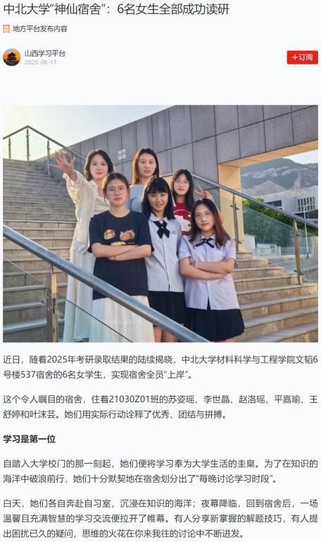 近日,随着2025年考研录取结果的陆续揭晓,中北大学材料科学与工程学院文韬6号楼537宿舍的6名女学生,实现宿舍全员“上岸”。