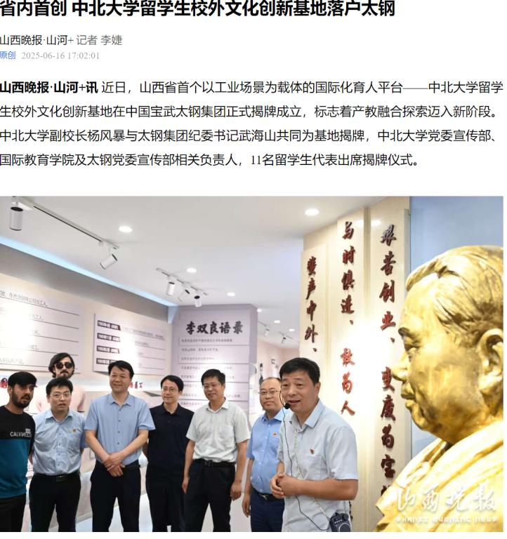 中北大学留学生校外文化创新基地的落成,为留学生搭建了沉浸式了解中国钢铁文化、感知中国企业创新发展的重要平台。未来,留学生们将在此深入体验太钢生产工艺与企业文化,与技术人员、一线员工面对面交流,在拓宽国际视野的同时深化跨文化交流。同时,校企双方将以基地为纽带,在科研创新、人才培养等领域开展更广泛、更深入的合作,共同开创“工业文明+国际教育”融合发展新范式。