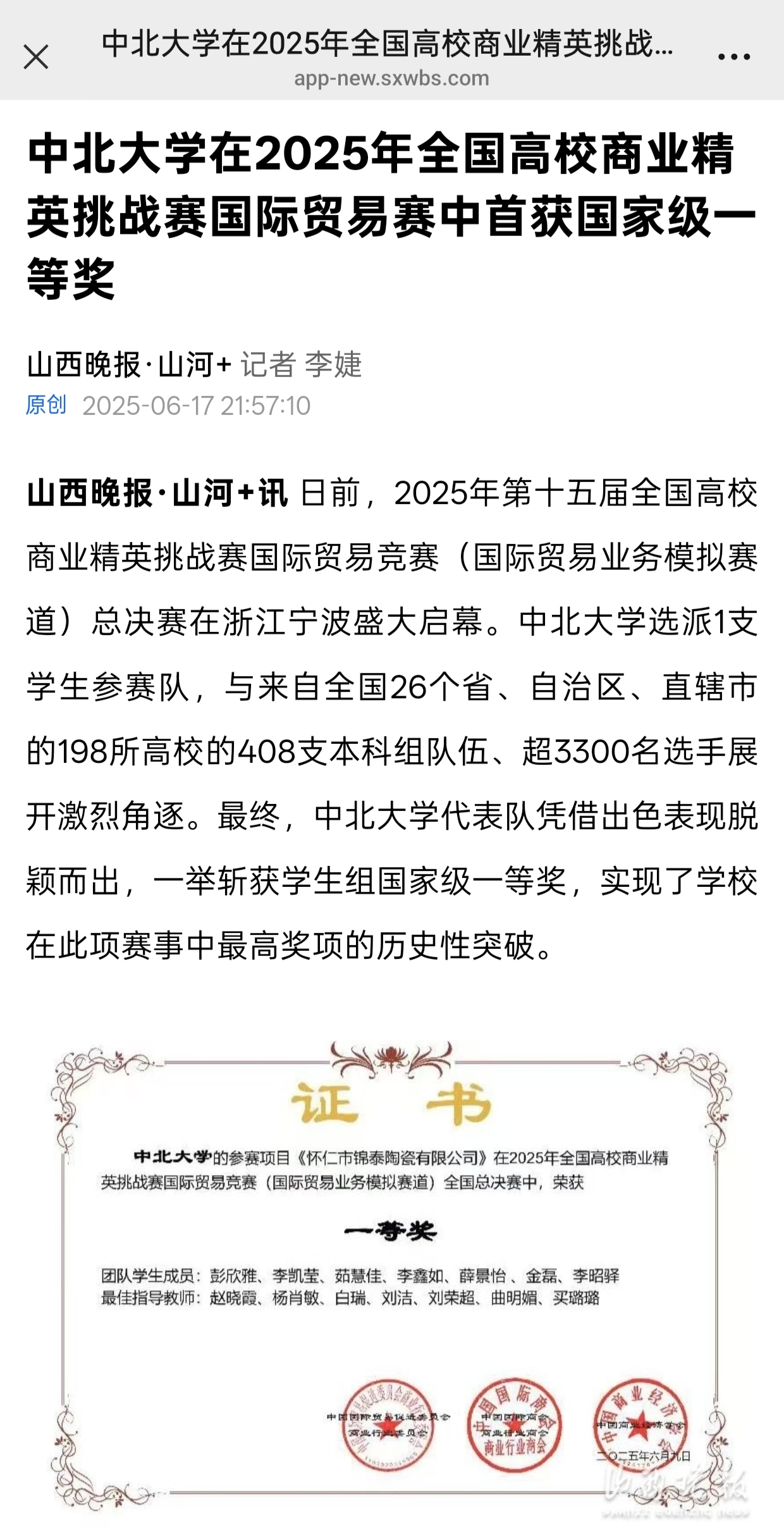 山西晚报·山河+讯 日前,2025年第十五届全国高校商业精英挑战赛国际贸易竞赛(国际贸易业务模拟赛道)总决赛在浙江宁波盛大启幕。中北大学选派1支学生参赛队,与来自全国26个省、自治区、直辖市的198所高校的408支本科组队伍、超3300名选手展开激烈角逐。最终,中北大学代表队凭借出色表现脱颖而出,一举斩获学生组国家级一等奖,实现了学校在此项赛事中最高奖项的历史性突破。