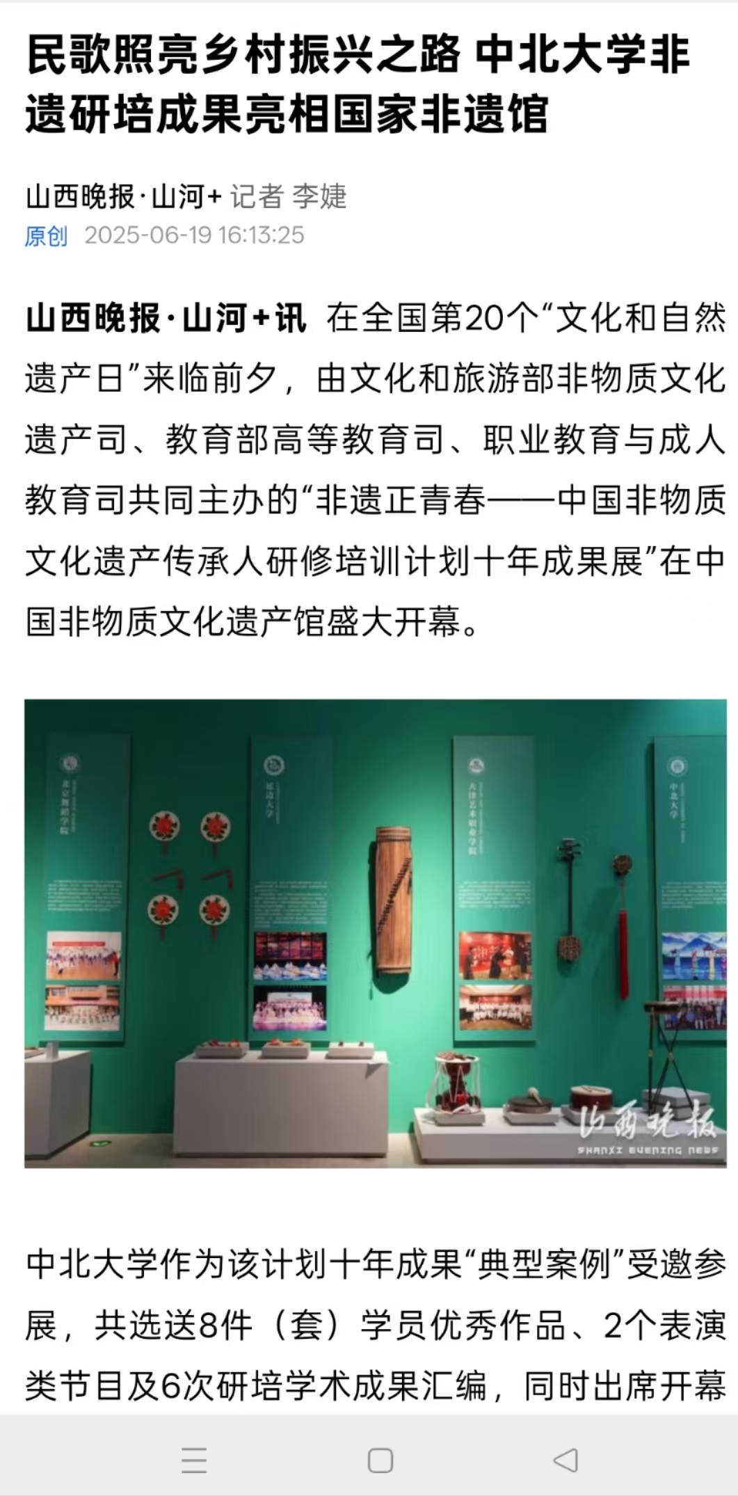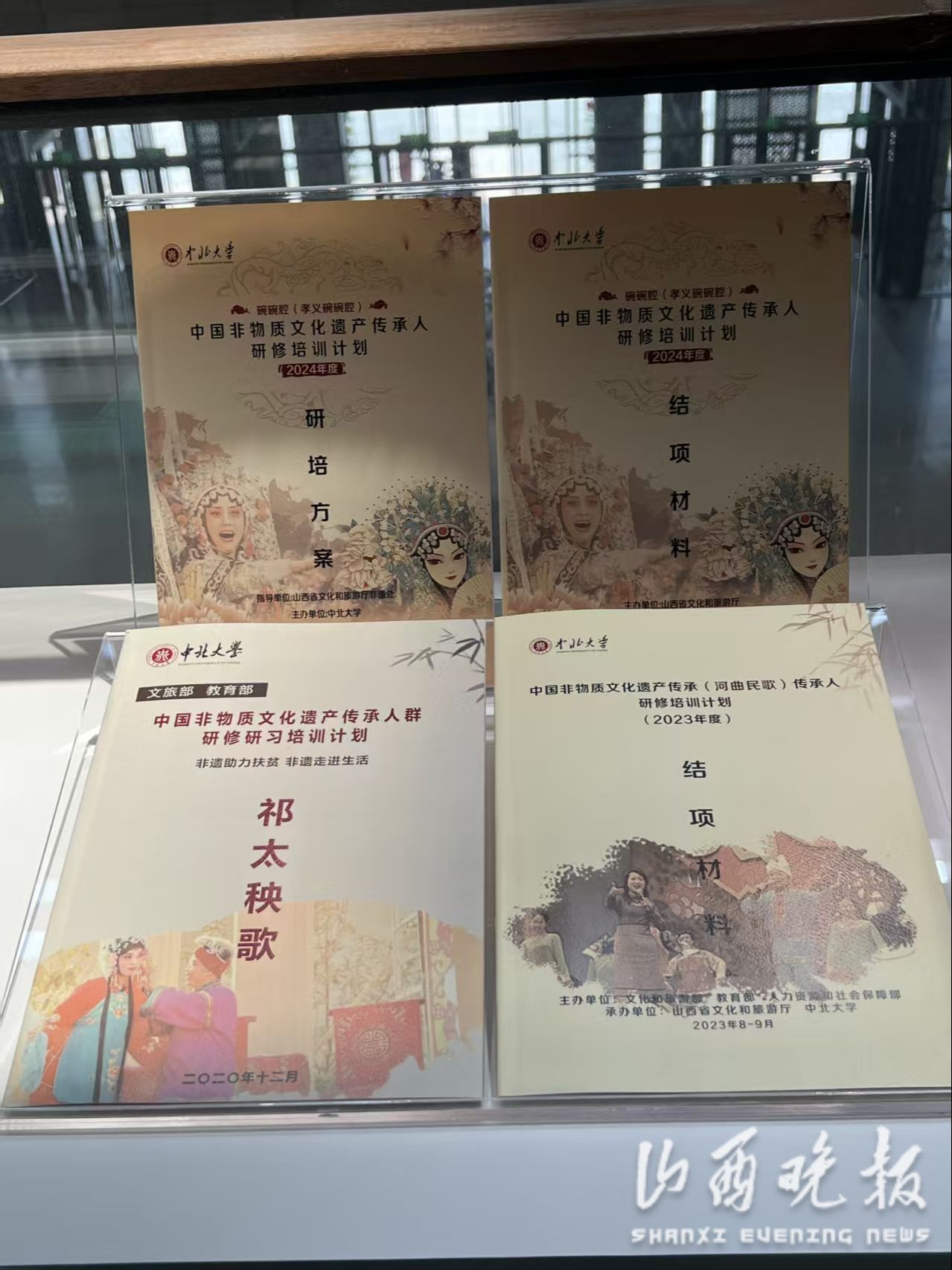 自开班以来,中北大学非遗研培成果斐然:孵化《孟母三迁》《太行花》等国家艺术基金项目;设计传统美术作品700余幅,制作工艺品860余件;挖掘整理传统民歌1250余首、戏剧20余部;举办雕刻、家具主题非遗展览50余场,传统戏剧与民歌音乐会35场;整理传承人口述材料近300万字,出版专著6部,发表核心论文27篇,开展走访调研150余次。2024年,学校协助郎昆团队打造大型非遗音乐剧《大河长歌》,推动河曲民歌走出国门,在阿联酋、迪拜等8国开展国际展演,为世界文明交流贡献中国非遗智慧。