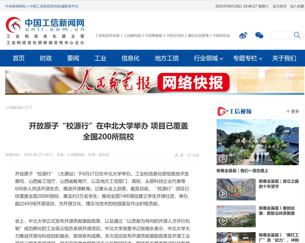 开放原子“校源行”(太原站)于6月27日在中北大学举办。工业和信息化部信息技术发展司、山西省工信厅、山西省教育厅,以及地方工信部门、高校、头部科技企业代表等600余人共话开源生态,推进开源教育。记者从会上获悉,截至目前,“校源行”项目已经覆盖全国200所院校,惠及约3万名学生;推动全国74所高校建立学生开源社团,举办超过450场开源活动,为开源文化、理念与技术的校园普及作出积极贡献。