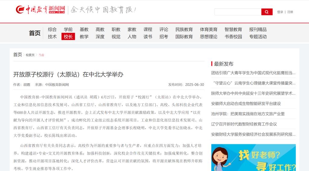 中国教育报-中国教育新闻网讯(通讯员 胡霞)6月27日,开放原子“校源行”(太原站)在中北大学举办。工业和信息化部信息技术发展司、山西省工信厅、山西省教育厅,以及地方工信部门、高校、头部科技企业代表等600余人共话开源生态,推进开源教育。会上正式发布中北大学开源贡献激励政策,以及中北大学应用“以贡献为导向的开源人才评价机制”,成功孵化的工业级云组态系统开源项目。工业和信息化部信息技术发展司、山西省教育厅、山西省工信厅有关负责同志,开放原子开源基金会理事长程晓明,中北大学党委书记张晓永,中北大学党委副书记、校长陈钱出席活动。