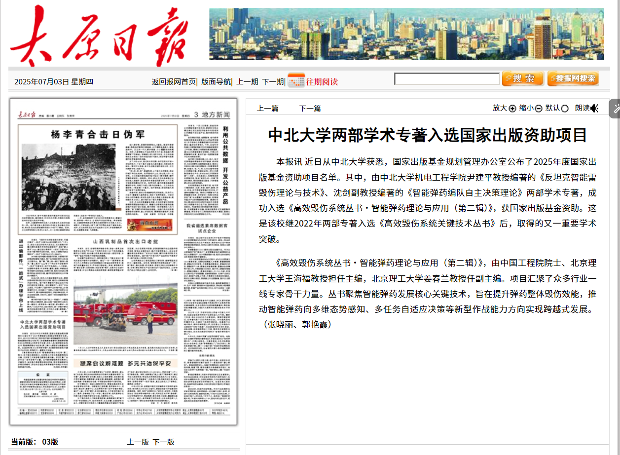 链接:太原日报数字报-中北大学两部学术专著入选国家出版资助项目