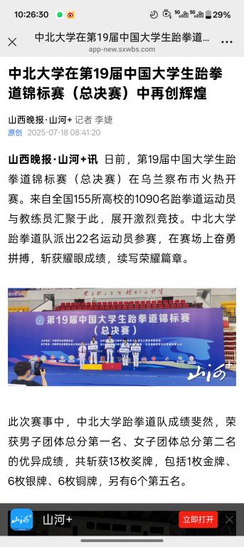 此次赛事中,中北大学跆拳道队成绩斐然,荣获男子团体总分第一名、女子团体总分第二名的优异成绩,共斩获13枚奖牌,包括1枚金牌、6枚银牌、6枚铜牌,另有6个第五名。