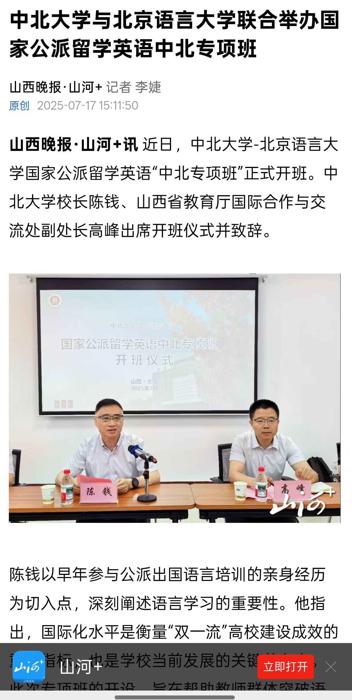 近日,中北大学-北京语言大学国家公派留学英语“中北专项班”正式开班。中北大学校长陈钱、山西省教育厅国际合作与交流处副处长高峰出席开班仪式并致辞。