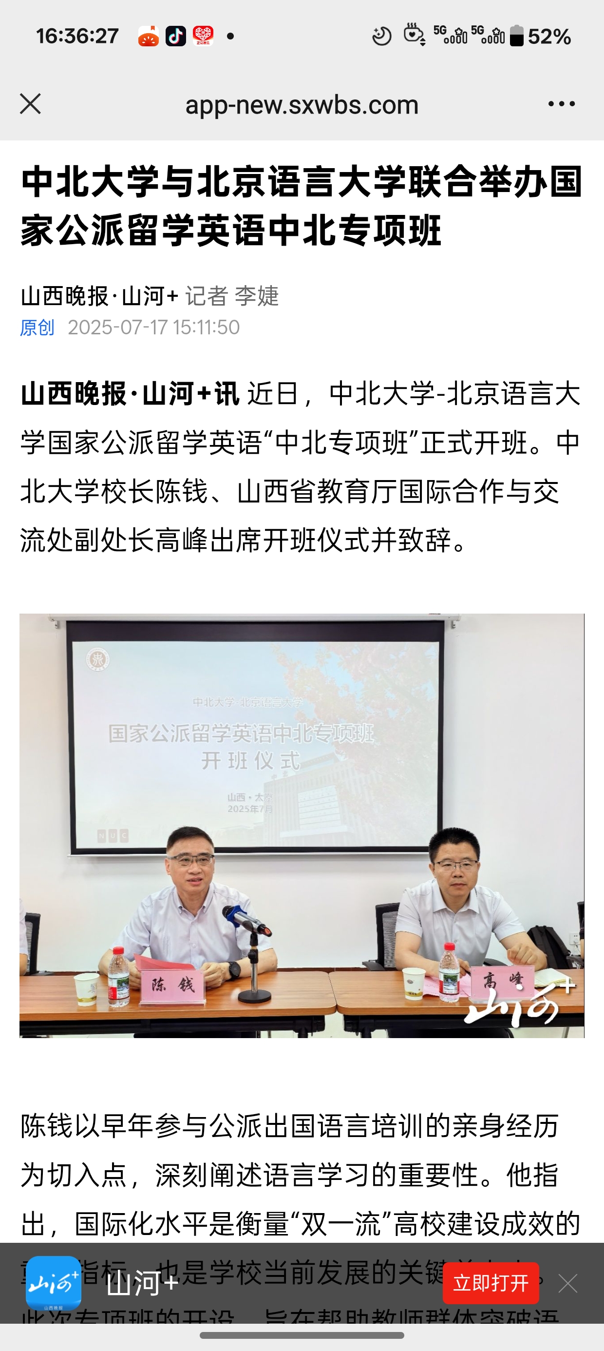 近日,中北大学-北京语言大学国家公派留学英语“中北专项班”正式开班。中北大学校长陈钱、山西省教育厅国际合作与交流处副处长高峰出席开班仪式并致辞。