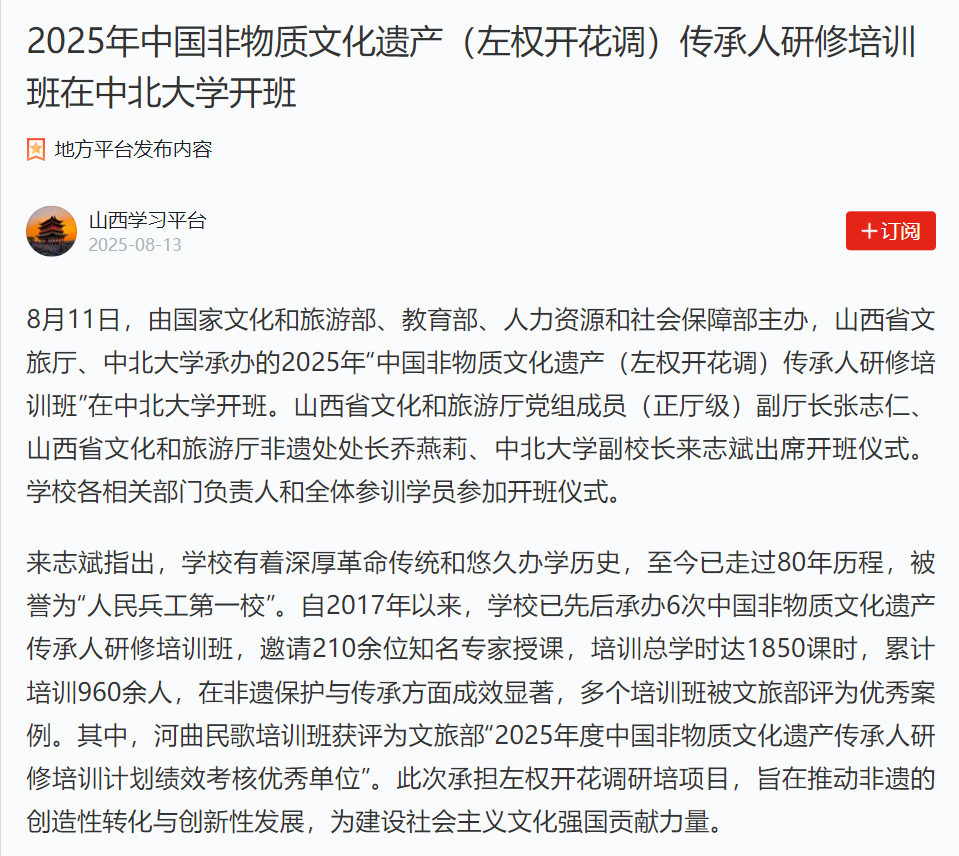 8月11日,由国家文化和旅游部、教育部、人力资源和社会保障部主办,山西省文旅厅、中北大学承办的2025年“中国非物质文化遗产(左权开花调)传承人研修培训班”在中北大学开班。山西省文化和旅游厅党组成员(正厅级)副厅长张志仁、山西省文化和旅游厅非遗处处长乔燕莉、中北大学副校长来志斌出席开班仪式。学校各相关部门负责人和全体参训学员参加开班仪式。