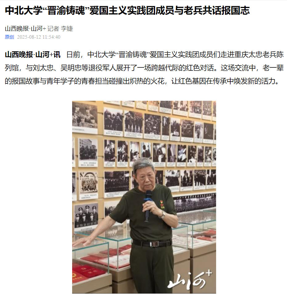 山西晚报·山河+讯 日前,中北大学“晋渝铸魂”爱国主义实践团成员们走进重庆太忠老兵陈列馆,与刘太忠、吴明忠等退役军人展开了一场跨越代际的红色对话。这场交流中,老一辈的报国故事与青年学子的青春担当碰撞出炽热的火花,让红色基因在传承中焕发新的活力。