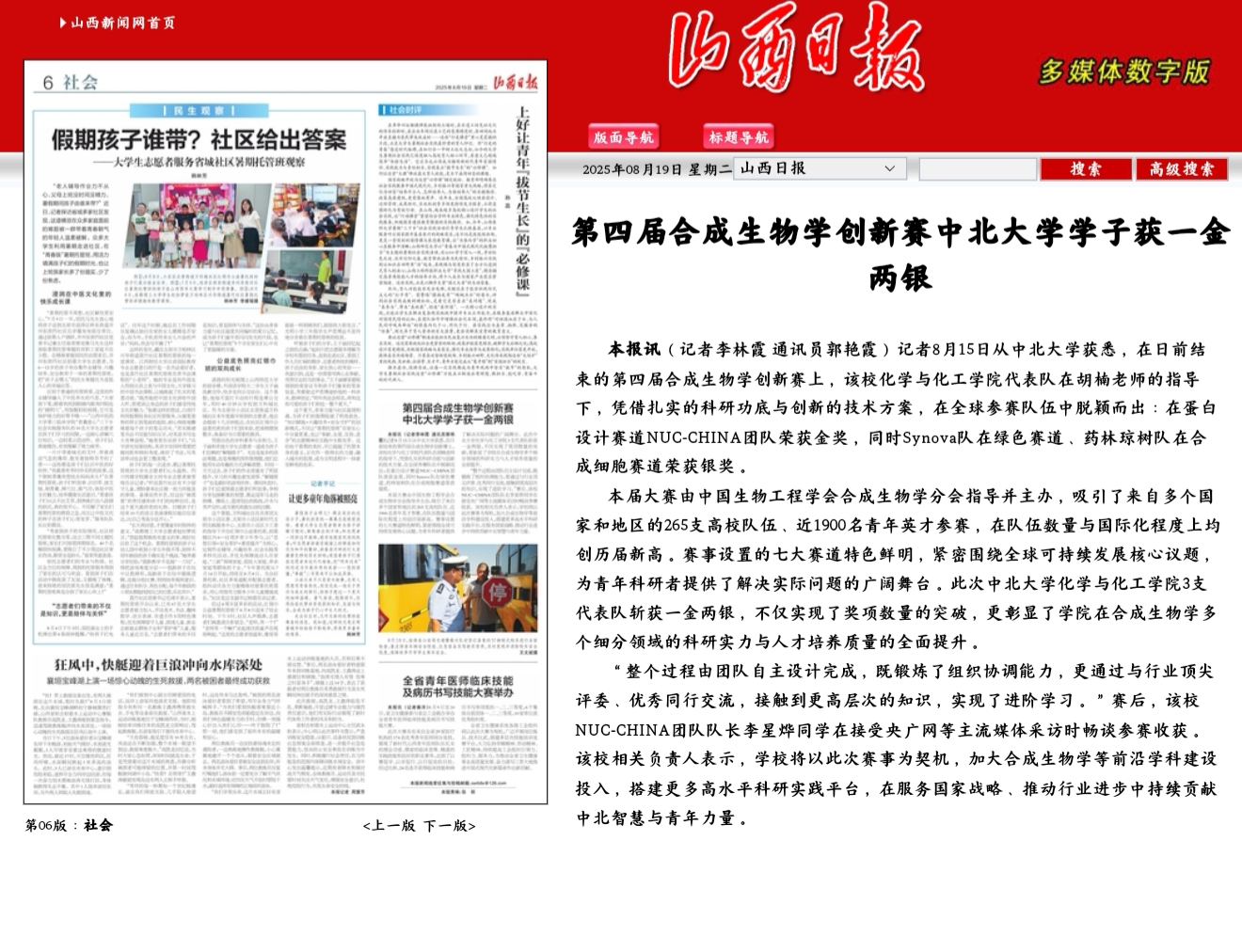 本报讯(记者李林霞 通讯员郭艳霞)记者8月15日从中北大学获悉,在日前结束的第四届合成生物学创新赛上,该校化学与化工学院代表队在胡楠老师的指导下,凭借扎实的科研功底与创新的技术方案,在全球参赛队伍中脱颖而出:在蛋白设计赛道NUC-CHINA团队荣获金奖,同时Synova队在绿色赛道、药林琼树队在合成细胞赛道荣获银奖。