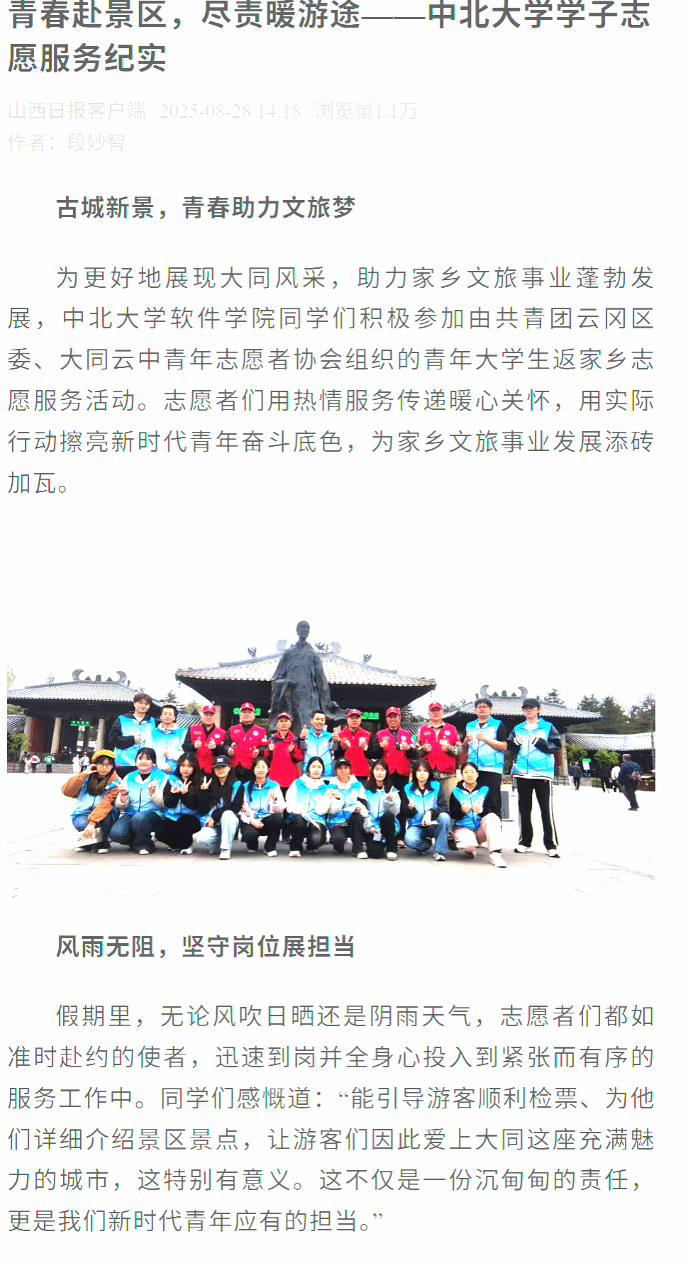 为更好地展现大同风采,助力家乡文旅事业蓬勃发展,中北大学软件学院同学们积极参加由共青团云冈区委、大同云中青年志愿者协会组织的青年大学生返家乡志愿服务活动。志愿者们用热情服务传递暖心关怀,用实际行动擦亮新时代青年奋斗底色,为家乡文旅事业发展添砖加瓦。