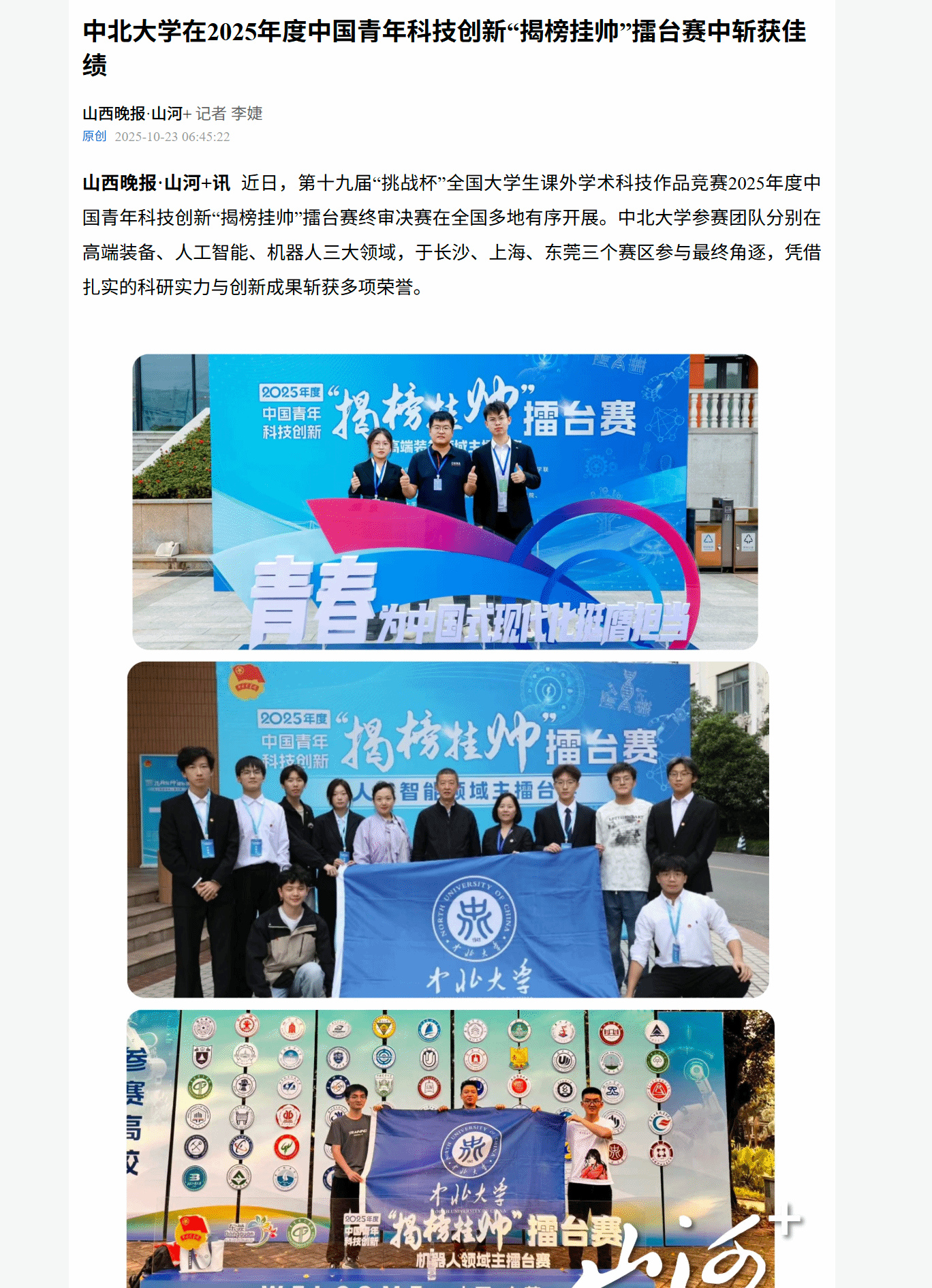 山西晚报·山河+讯 近日,第十九届“挑战杯”全国大学生课外学术科技作品竞赛2025年度中国青年科技创新“揭榜挂帅”擂台赛终审决赛在全国多地有序开展。中北大学参赛团队分别在高端装备、人工智能、机器人三大领域,于长沙、上海、东莞三个赛区参与最终角逐,凭借扎实的科研实力与创新成果斩获多项荣誉。