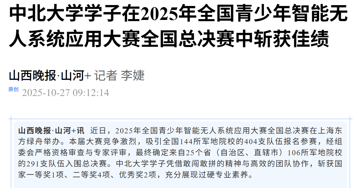 山西晚报·山河+讯 近日,2025年全国青少年智能无人系统应用大赛全国总决赛在上海东方绿舟举办。本届大赛竞争激烈,吸引全国144所军地院校的404支队伍报名参赛,经组委会严格资格审查与专家评审,最终确定来自25个省(自治区、直辖市)106所军地院校的291支队伍入围总决赛。中北大学学子凭借敢闯敢拼的精神与高效的团队协作,斩获国家一等奖1项、二等奖4项、优秀奖2项,充分展现过硬专业素养。