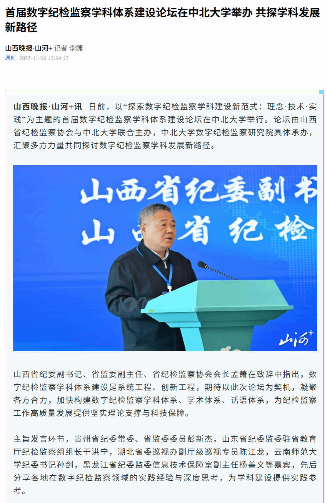 山西晚报·山河+讯 日前,以“探索数字纪检监察学科建设新范式:理念·技术·实践”为主题的首届数字纪检监察学科体系建设论坛在中北大学举行。论坛由山西省纪检监察协会与中北大学联合主办,中北大学数字纪检监察研究院具体承办,汇聚多方力量共同探讨数字纪检监察学科发展新路径。