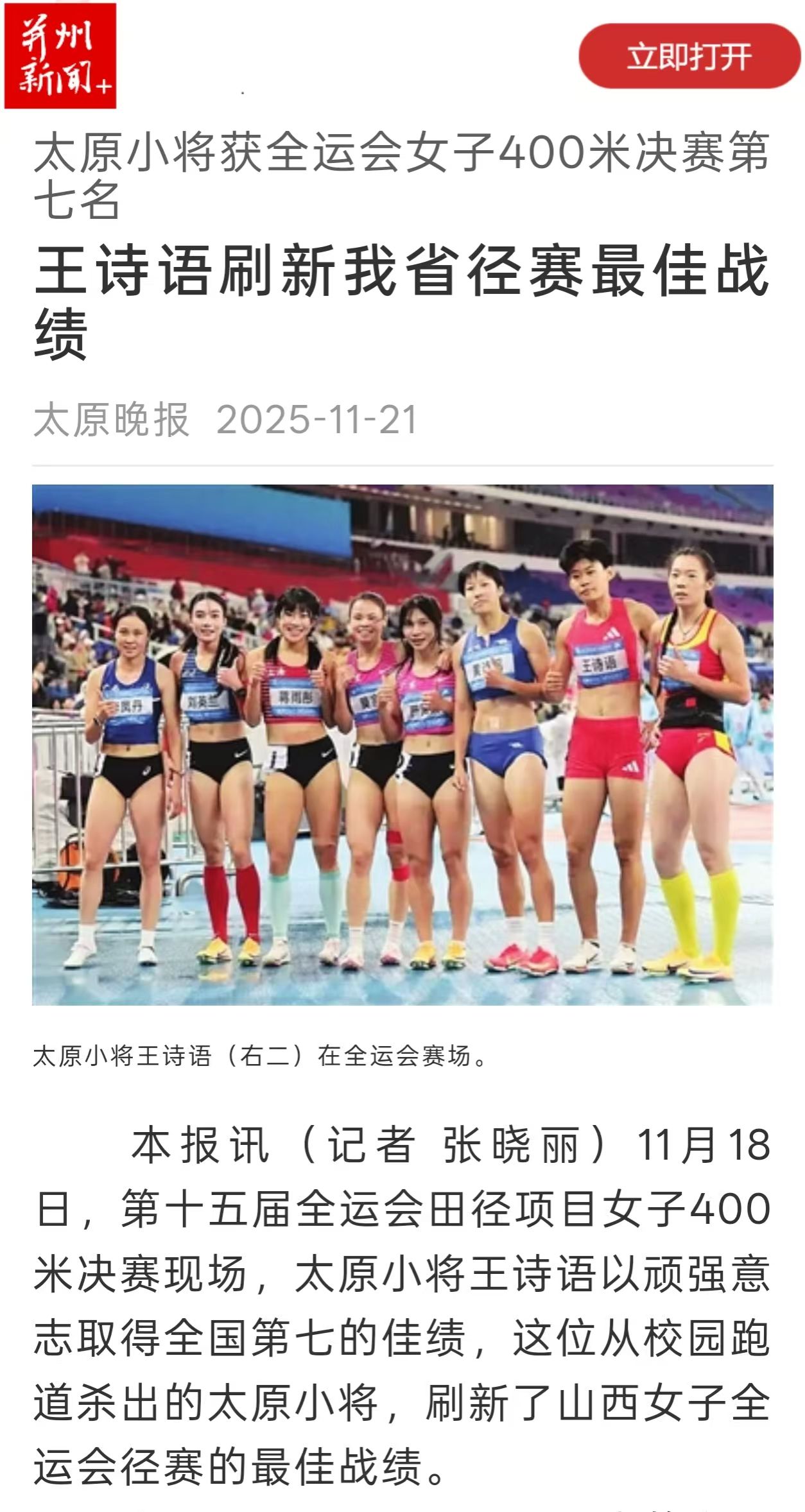 作为山西代表团田径项目中的学生选手,王诗语能站上全运会决赛的跑道,本身就是一种胜利。王诗语是土生土长的太原人,曾在太原十五中田径队训练,在校期间曾获得“国家一级运动员”称号,2024年考入中北大学,继续追逐体育梦想。