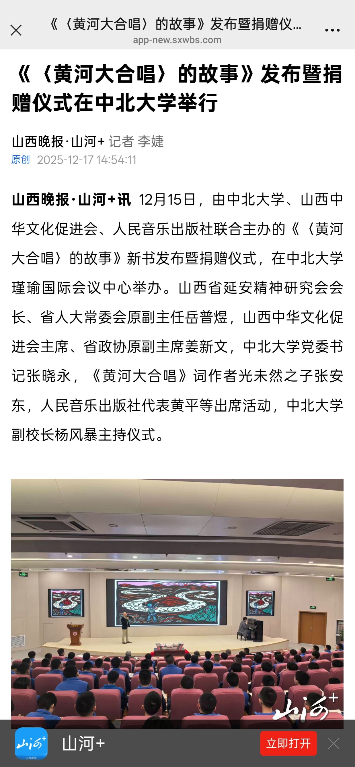 据悉,中北大学是《〈黄河大合唱〉的故事》新书发布暨捐赠活动的第二站,首站设于中国人民大学。该活动将跨越全国十个城市,通过图书捐赠、文化讲座、艺术展演等多元形式,让《〈黄河大合唱〉的故事》走出书页,让黄河精神跨越地域,如黄河之水般绵延流淌,滋养更多人的精神世界。(本报记者 李婕)