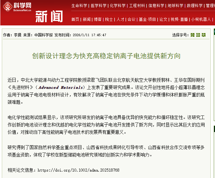 近日,中北大学能源与动力工程学院教授梁君飞团队联合北京航天航空大学教授郭林、王华在国际期刊《先进材料》(Advanced Materials)上发表了重要研究成果。该论文开创性地将超小超薄非晶理念运用于钠离子电池电极材料设计,有效解决了钠离子电池在快充条件下动力学缓慢和体积膨胀严重的瓶颈难题。