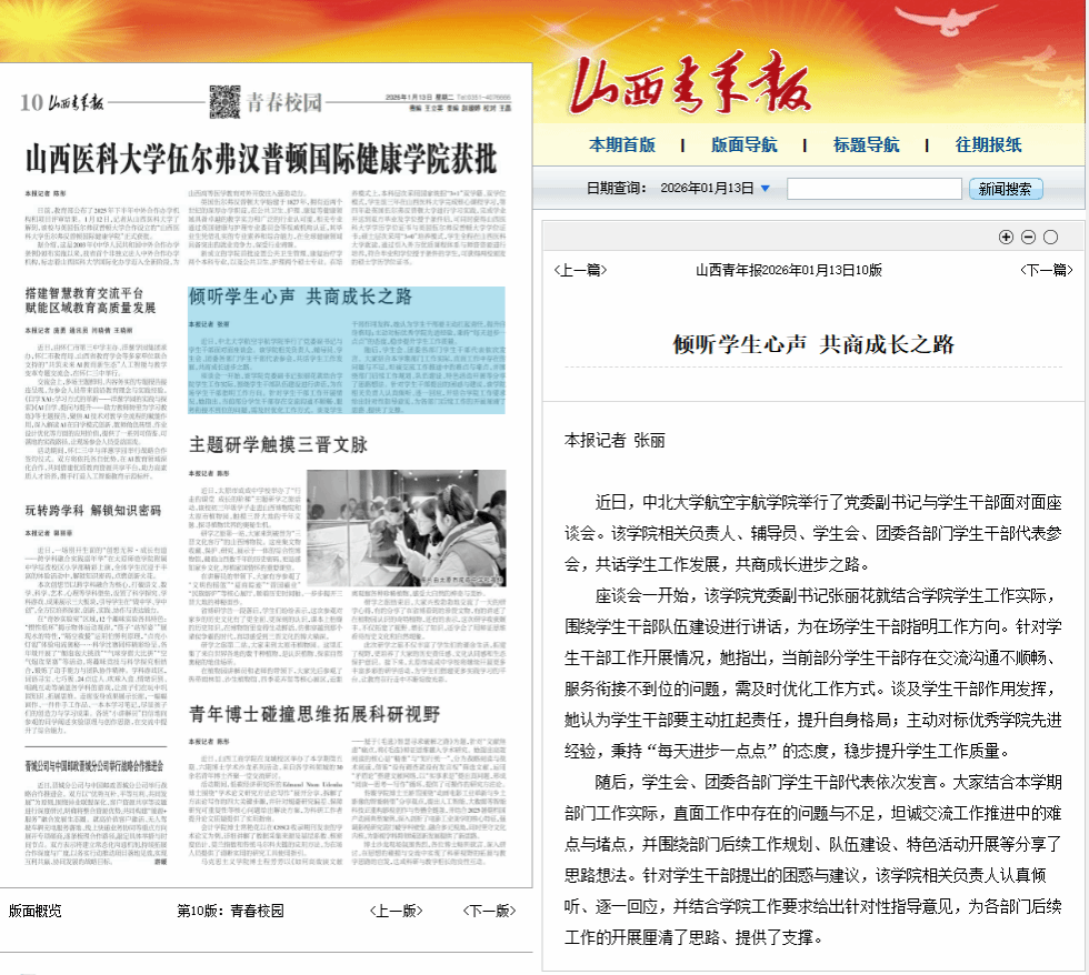 近日,中北大学航空宇航学院举行了党委副书记与学生干部面对面座谈会。该学院相关负责人、辅导员、学生会、团委各部门学生干部代表参会,共话学生工作发展,共商成长进步之路。 座谈会一开始,该学院党委副书记张丽花就结合学院学生工作实际,围绕学生干部队伍建设进行讲话,为在场学生干部指明工作方向。针对学生干部工作开展情况,她指出,当前部分学生干部存在交流沟通不顺畅、服务衔接不到位的问题,需及时优化工作方式。谈及学生干部作用发挥,她认为学生干部要主动扛起责任,提升自身格局;主动对标优秀学院先进经验,秉持“每天进步一点点”的态度,稳步提升学生工作质量。 随后,学生会、团委各部门学生干部代表依次发言。大家结合本学期部门工作实际,直面工作中存在的问题与不足,坦诚交流工作推进中的难点与堵点,并围绕部门后续工作规划、队伍建设、特色活动开展等分享了思路想法。针对学生干部提出的困惑与建议,该学院相关负责人认真倾听、逐一回应,并结合学院工作要求给出针对性指导意见,为各部门后续工作的开展厘清了思路、提供了支撑。