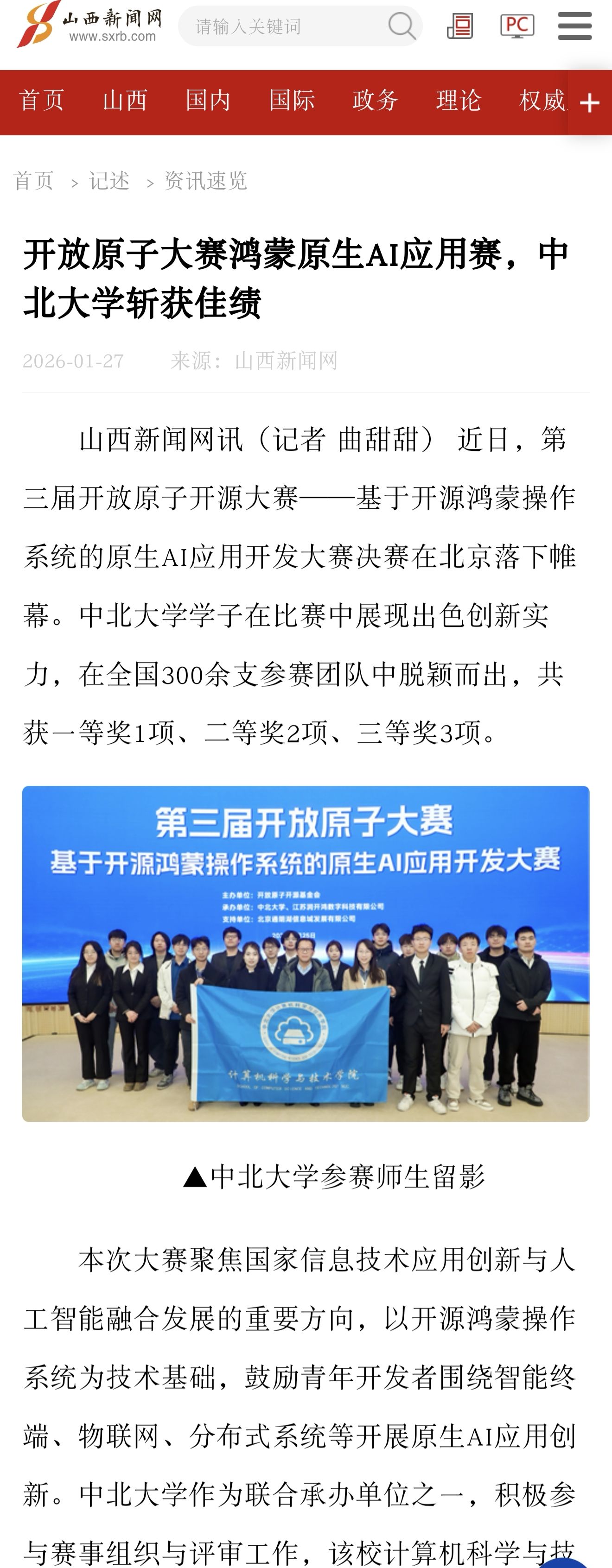 山西新闻网讯 近日,第三届开放原子开源大赛——基于开源鸿蒙操作系统的原生AI应用开发大赛决赛在北京落下帷幕。中北大学学子在比赛中展现出色创新实力,在全国300余支参赛团队中脱颖而出,共获一等奖1项、二等奖2项、三等奖3项。