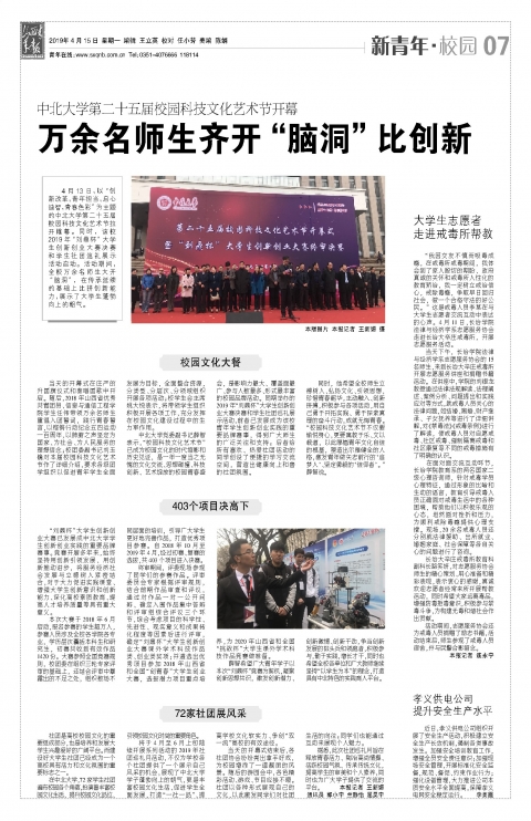 4月13日,以“创新改革,青年担当,启心迪智,青春色彩”为主题的中北大学第二十五届校园科技文化艺术节拉开帷幕。同时,该校2019年“刘鼎杯”大学生创新创业大赛决赛和学生社团巡礼展示活动启动。活动期间,全校万余名师生大开“脑洞”,在传承延续的基础上比拼创新能力,展示了大学生蓬勃向上的朝气。