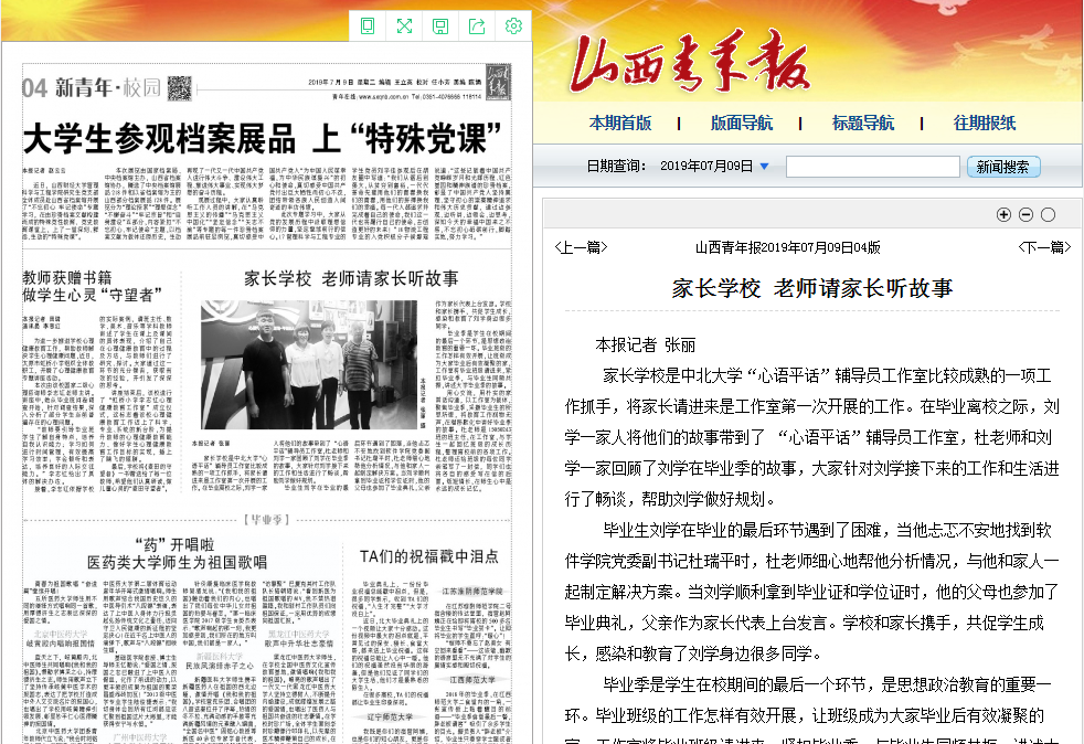 家长学校是中北大学“心语平话”辅导员工作室比较成熟的一项工作抓手,将家长请进来是工作室第一次开展的工作。在毕业离校之际,刘学一家人将他们的故事带到了 “心语平话”辅导员工作室,杜老师和刘学一家回顾了刘学在毕业季的故事,大家针对刘学接下来的工作和生活进行了畅谈,帮助刘学做好规划。