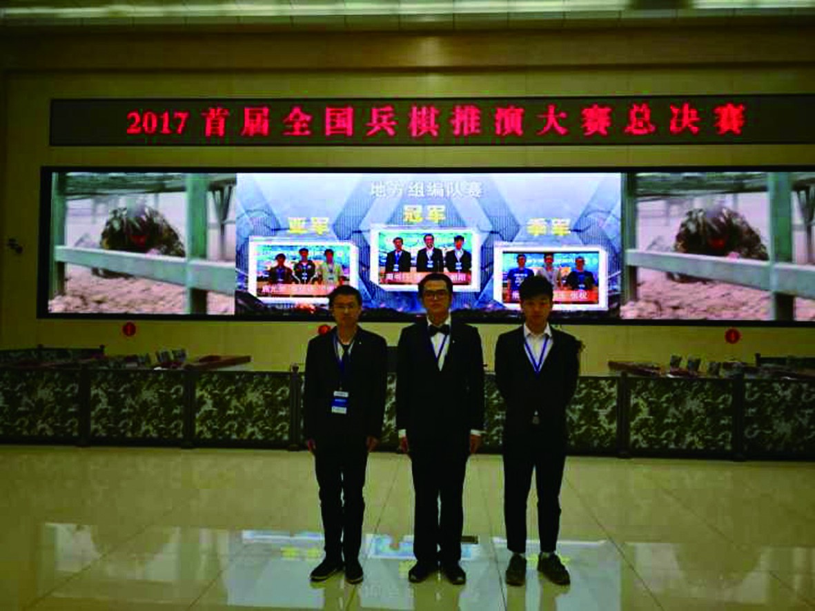 9月25日,石家庄联合作战学院,首届全国兵棋推演大赛编队赛决赛正在激烈对决。在这场看不见硝烟的“战争”中,红方代表队在被蓝方歼灭了两组坦克、落后蓝方70多分的不利战况下,沉着冷静,临时决定向上路派遣四组坦克,原先在上路放置的伏兵也改为下路,一路打穿上路,与敌方坦克火拼到底。最终将敌方进攻的坦克全部消灭,取得了此次全国兵棋推演大赛编队赛组冠军。“我们大获全胜!”获胜后的红方代表队三位同学激动地喊出了声,拥抱在一起。从全国众多赛区冠军中脱颖而出,又战胜实力强劲的网友组,他们的冠军实至名归。他们就是来自我校2016级飞行器设计与工程专业的周书行,2015级武器系统与工程专业陈一波和2015级武器系统与工程专业亓朝阳。比赛中,他们用实力展示出“人民兵工第一校”的战斗雄姿。