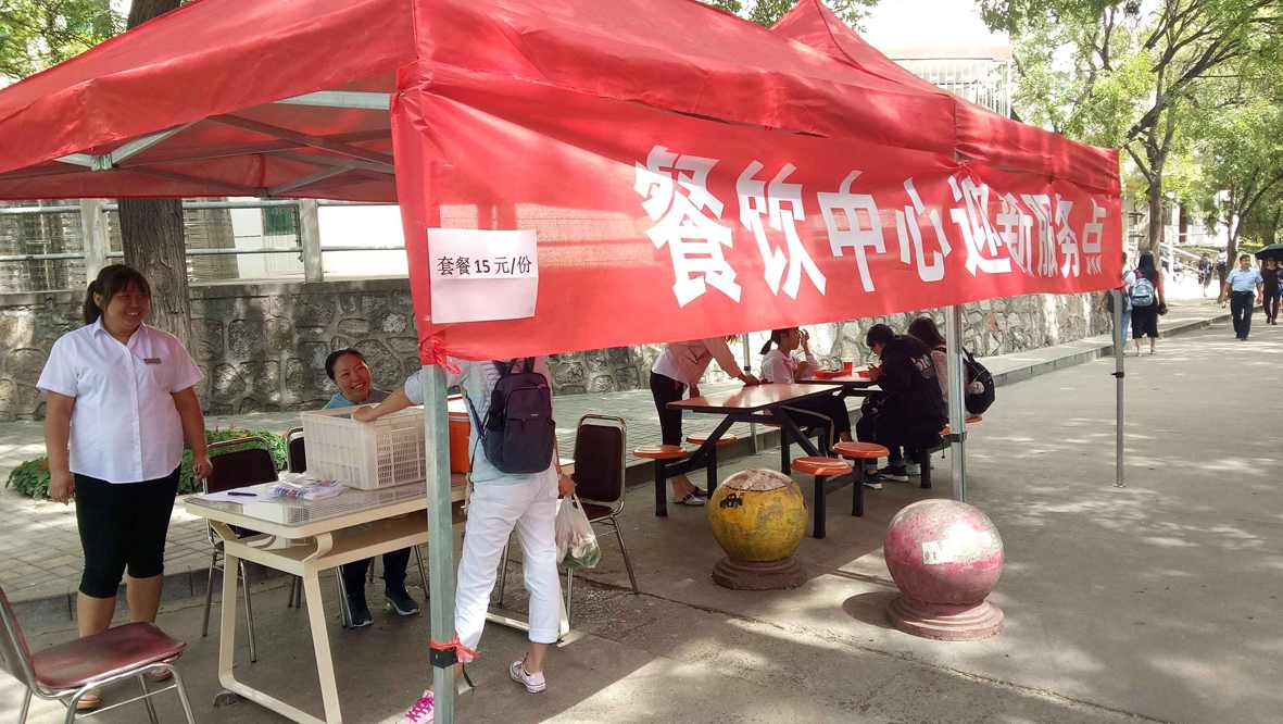 今年的迎新工作处处体现着人文情怀。进入二道门,映入眼帘的便是餐饮部临时就餐点。两张桌子,一个棚子,方便了家长和新生就餐,免去了寻找食堂的麻烦。旧篮球场迎新点还设置了“免费热水点”,方便新生及家长接取热水。