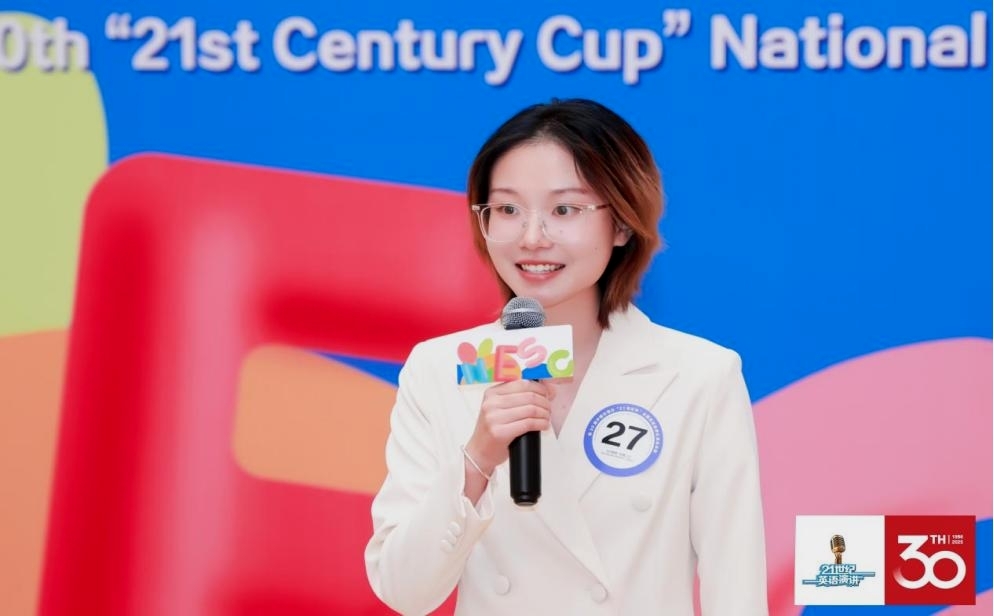 总决赛中,解焱文围绕大会主题“Living within and beyond the 21st century”,以祖母的故事为切入点,结合二十一世纪青年典型事例,阐述了对时代变迁的深刻理解,强调全球胜任力与未来塑造力的重要性,呼吁青年一代成为积极的分析者、思考者与共创者。她的演讲内容层次分明、情感真挚,体现了当代大学生对文化传承与时代发展的双向思考。备赛期间,指导教师团队精准发力,从演讲内容架构、语言表达技巧、逻辑思维训练到临场应变策略等方面,为解焱文同学提供了系统、深入的指导,助力其在高压竞赛环境中沉着应战、稳定发挥,最终取得优异成绩。
