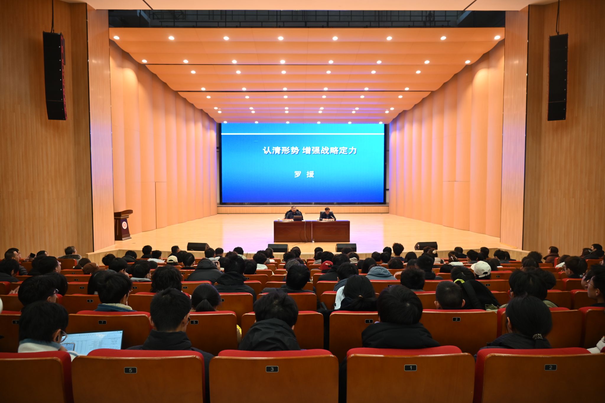 11月28日,校党委理论学习中心组(扩大)学习会在科艺苑报告厅召开。会议特邀罗援将军来校,以《认清形势 增强战略定力》为题作专题报告。校党委理论学习中心组成员及800余名师生代表参加学习。校长陈钱主持会议。
