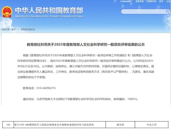 9月25日,教育部社科司发布《2025年度教育部人文社会科学研究项目评审结果公示》,我校仪器与电子学院辅导员郭乐祥主持申报的《基于CIPP-AHP模型的军工院校总体国家安全观教育成效评价与优化研究》成功获批高校辅导员研究专项项目。这是我校学工队伍在该类别项目上的首次成功立项,标志着我校大学生思想政治教育领域科研创新迈入国家级平台。
