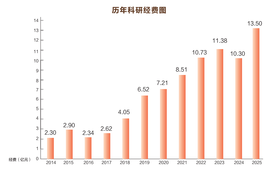 我校科研经费连续四年突破10亿元,2025年达13.5亿元,创历史新高。