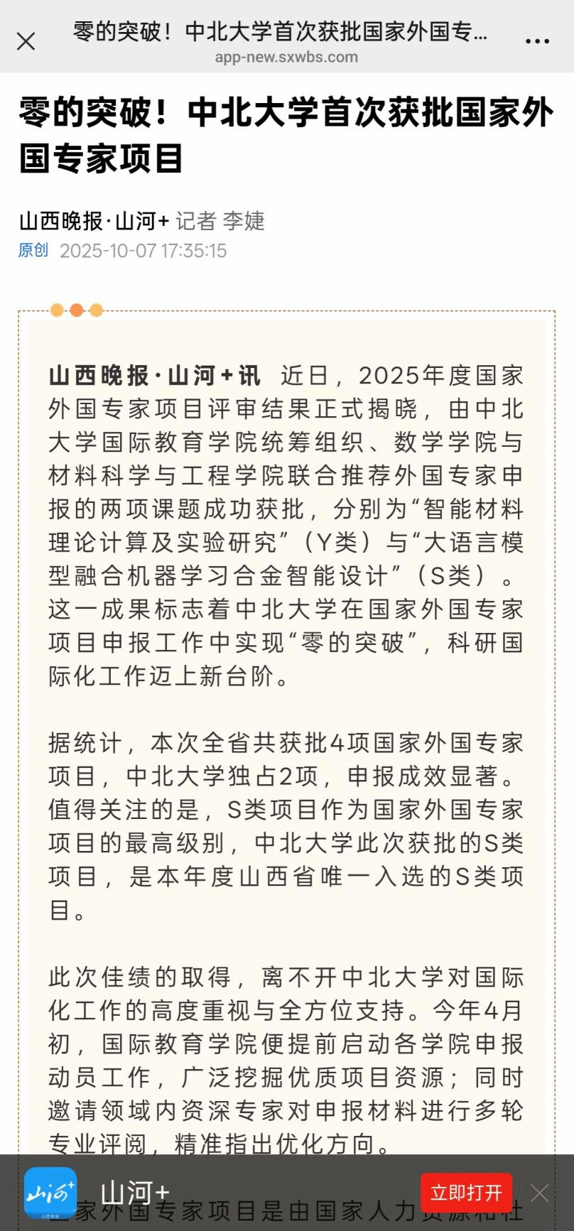 2025年度国家外国专家项目评审结果揭晓,由我校国际教育学院组织、数学学院和材料科学与工程学院推荐外国专家申报的两项课题成功获批,分别为“智能材料理论计算及实验研究”(Y类)和“大语言模型融合机器学习合金智能设计”( S类),标志着我校在国家外国专家项目上实现了“零的突破”。本次全省共获批4项该类项目,我校获得2项,成果显著。其中,S类是国家外国专家项目最高级别,我校此次获批的S类项目是本年度全省唯一入选的S类项目。