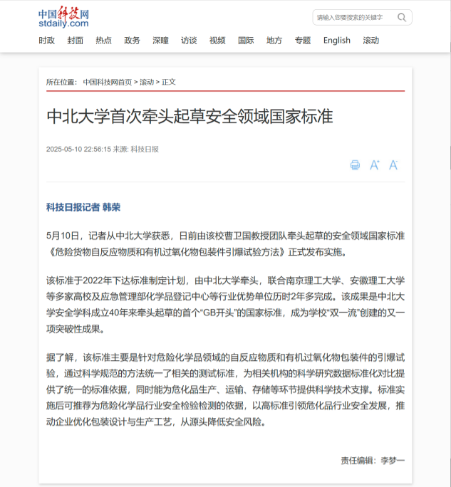 5月1日,国家标准(编号:GB/T 45217-2025)《危险货物自反应物质和有机过氧化物包装件引爆试验方法》正式批准发布实施。该标准于2022年下达标准制定计划,由我校环境与安全工程学院曹卫国教授团队牵头,联合南京理工大学、安徽理工大学等多家高校及应急管理部化学品登记中心等行业优势单位历时2年多完成。该成果是我校安全学科成立40年来牵头起草的首个“GB”开头的国家标准,成为学校“双一流”创建的又一项突破性成果。