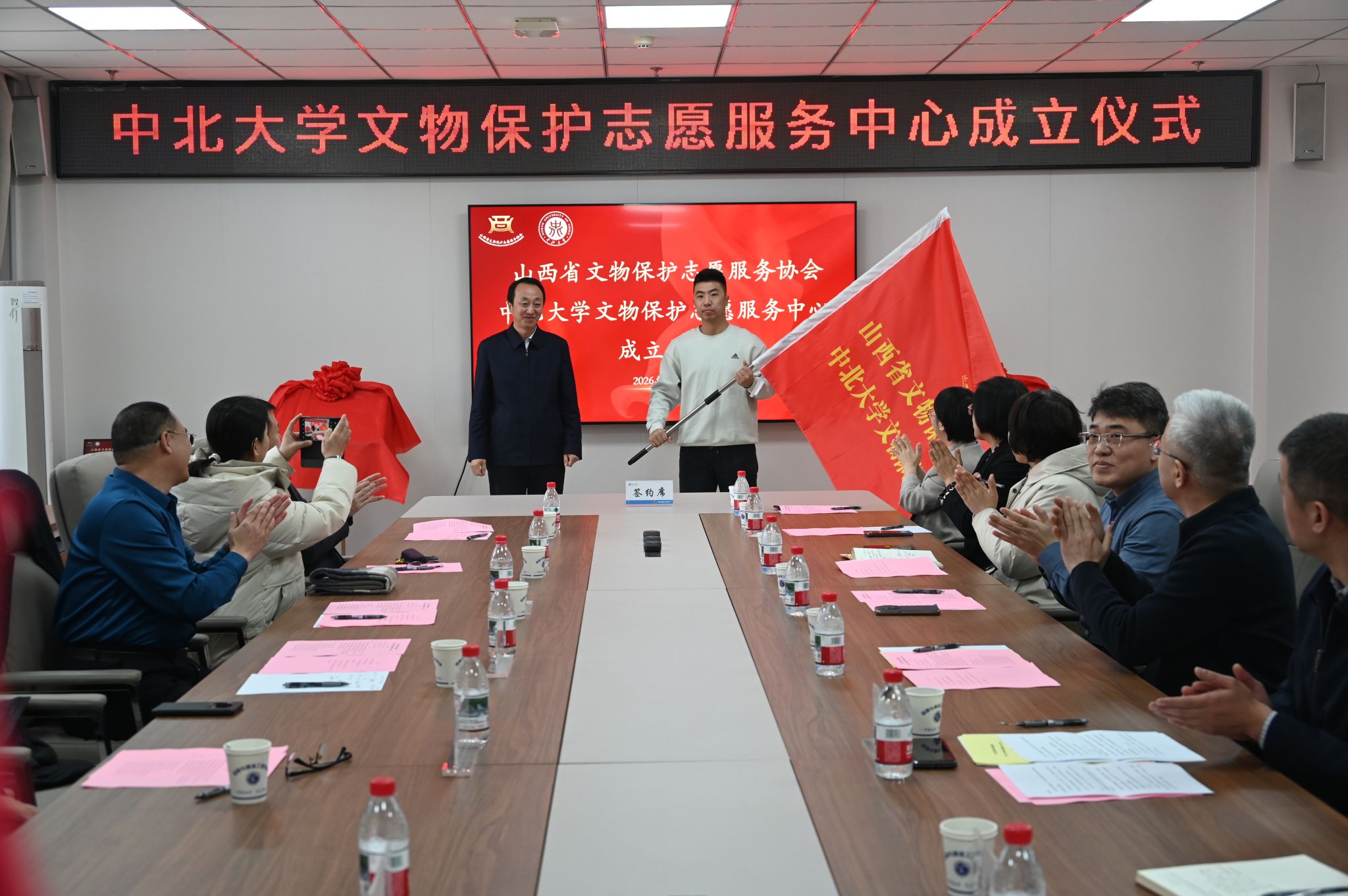 1月27日,山西省文物保护志愿服务协会——中北大学文物保护志愿服务中心成立仪式在我校信息与通信工程学院713会议室举行。校党委副书记赵文军,山西省文物局副局长、省文物保护志愿服务协会会长白雪冰出席仪式,共同为中心揭牌,白雪冰还为我校文物保护志愿服务队队员代表授旗。山西省文物保护志愿服务协会常务副会长兼秘书长李强受聘为我校名誉教授,并代表协会与我校签署合作协议。