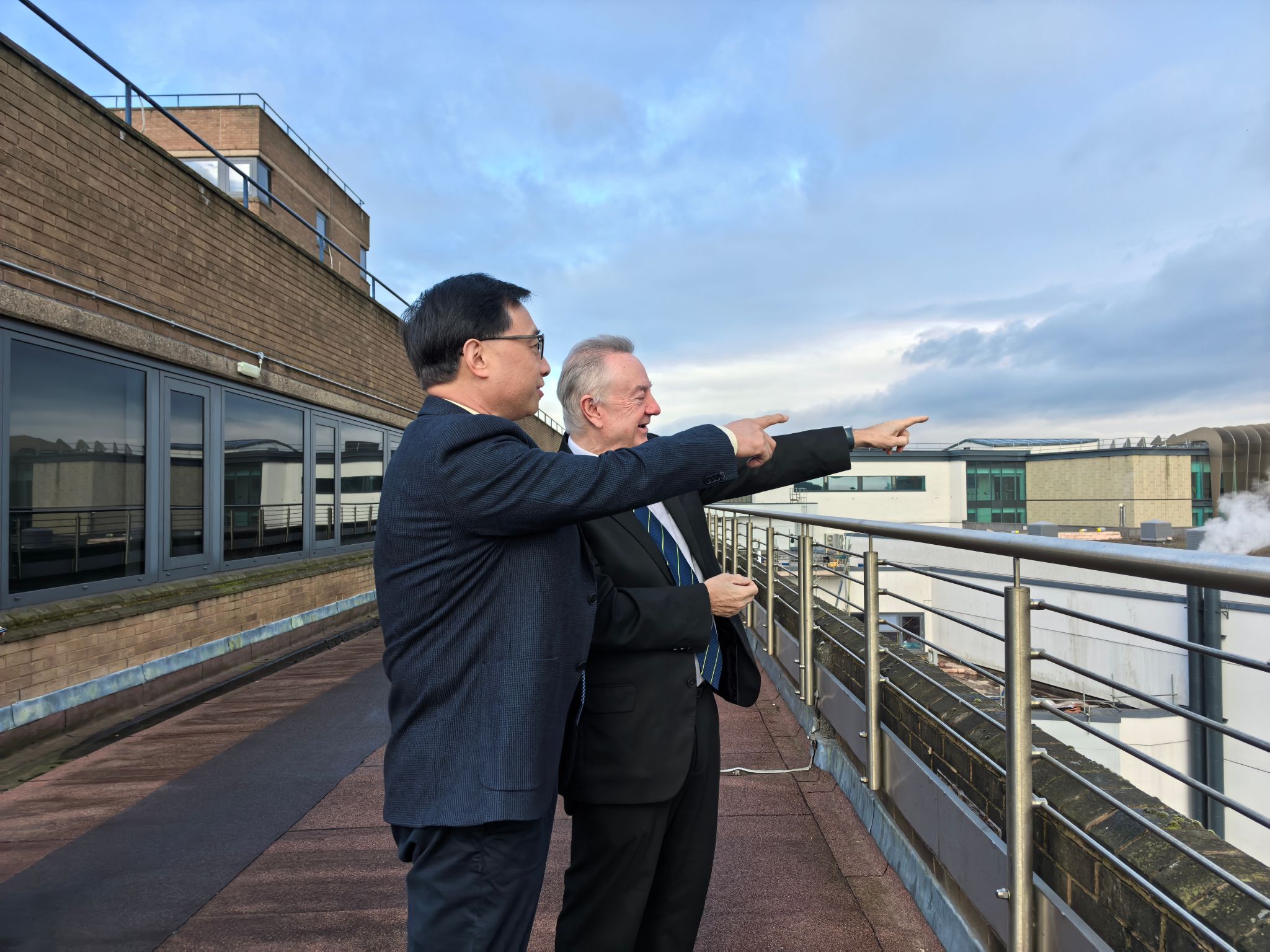 哈德斯菲尔德大学校长Bob Cryan对我校代表团到访表示欢迎。他邀请代表团登上校长办公区观景平台,俯瞰校园及周边风貌,并详细介绍了学校历史、建筑特色、优势学科及国际合作项目等情况。他表示,十分期待与中北大学开展实质性合作,加强师生互访,共同培养具有国际视野的高素质人才,建立长期稳定的教育交流与合作关系。