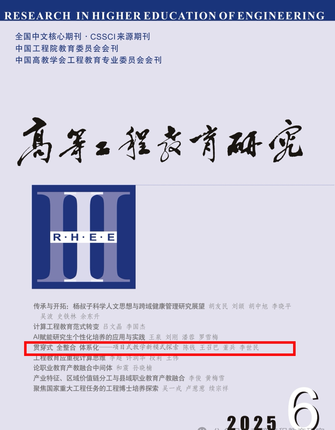 近日,校长陈钱在《高等工程教育研究》期刊(2025年第6期) 发表题为《贯穿式 全整合 体系化——项目式教学新模式探索》的高水平教育教学研究论文。该期刊为CSSCI来源期刊、全国中外文核心期刊、中国工程院教育委员 -