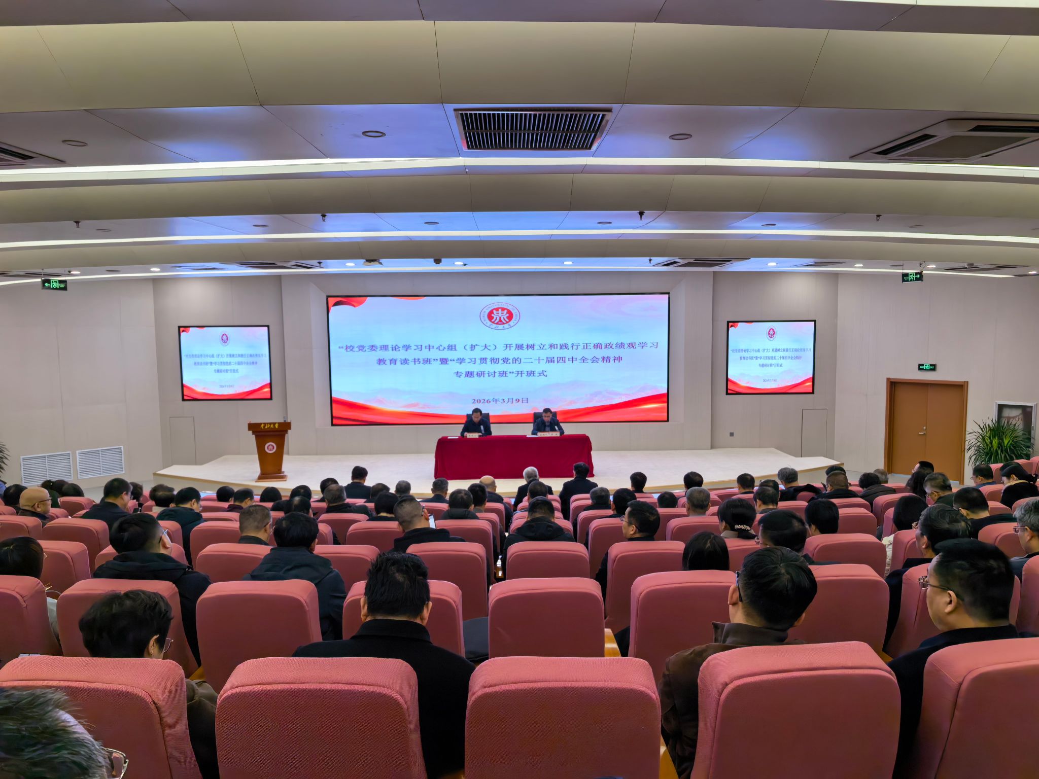 3月9日,校党委理论学习中心组(扩大)开展树立和践行正确政绩观学习教育读书班暨学习贯彻党的二十届四中全会精神专题研讨班开班仪式隆重举行。校党委书记张晓永作开班动员讲话,党委副书记、校长陈钱主持开班仪式, -