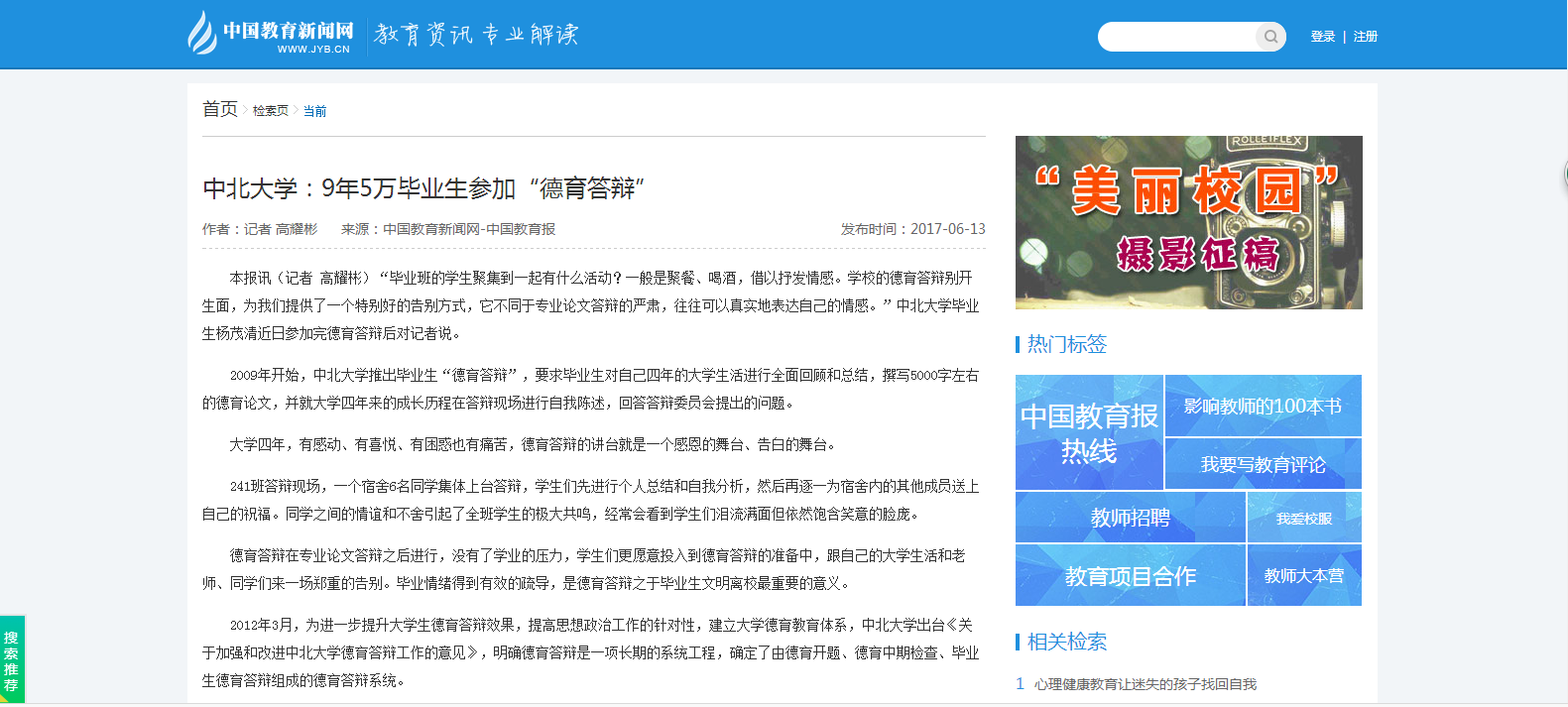 2017年6月13日,中国教育新闻网-中国教育报以“中北大学:9年5万毕业生参加‘德育答辩’”为题报道了我校德育答辩工作情况。