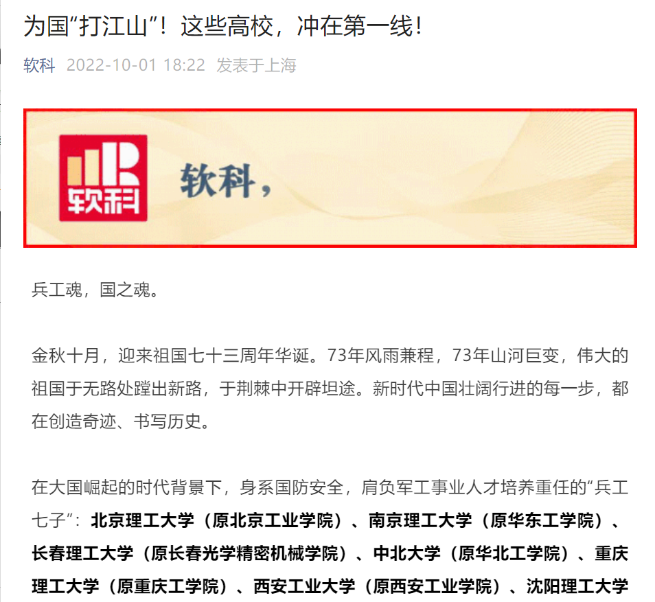 在大国崛起的时代背景下,身系国防安全,肩负军工事业人才培养重任的“兵工七子”:北京理工大学(原北京工业学院)、南京理工大学(原华东工学院)、长春理工大学(原长春光学精密机械学院)、中北大学(原华北工学院)、重庆理工大学(原重庆工学院)、西安工业大学(原西安工业学院)、沈阳理工大学(原沈阳工业学院),自建国以来,便为国家的发展和国防、兵器事业做出了特殊而又重大的贡献。