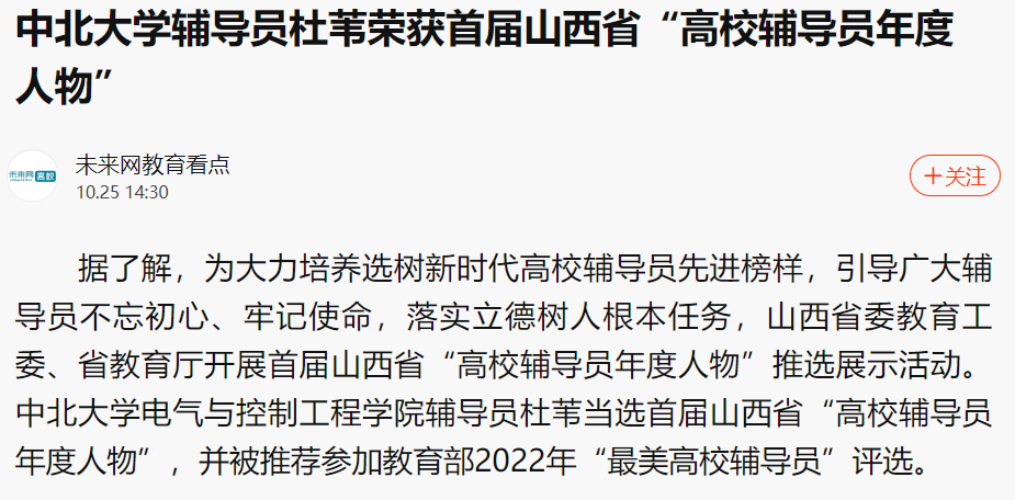 据了解,为大力培养选树新时代高校辅导员先进榜样,引导广大辅导员不忘初心、牢记使命,落实立德树人根本任务,山西省委教育工委、省教育厅开展首届山西省“高校辅导员年度人物”推选展示活动。中北大学电气与控制工程学院辅导员杜苇当选首届山西省“高校辅导员年度人物”,并被推荐参加教育部2022年“最美高校辅导员”评选。