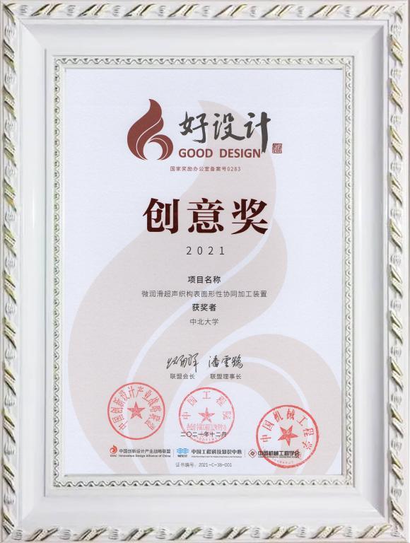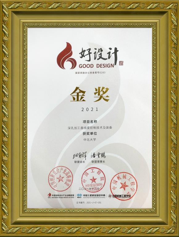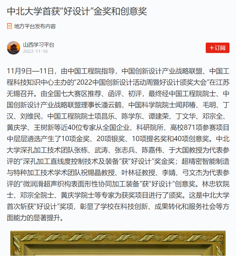 11月9日—11日,由中国工程院指导,中国创新设计产业战略联盟、中国工程科技知识中心主办的“2022中国创新设计活动周暨好设计颁奖大会”在江苏无锡召开。由全国七大赛区推荐、函评、初评,最终经中国工程院院士、中国创新设计产业战略联盟理事长潘云鹤,中国科学院院士闻邦椿、毛明、丁汉、刘维民,中国工程院院士项昌乐、陈学东、谭建荣、丁文华、邓宗全、黄庆学、王树新等近40位专家从全国企业、科研院所、高校871项参赛项目中层层遴选产生了10项金奖、20项银奖、10项提名奖和40项创意奖。中北大学深孔加工技术团队张栋、武涛、张志兵、陈嘉伟、于大国教授为代表参评的“深孔加工直线度控制技术及装备”获“好设计”奖金奖;超精密智能制造与特种加工技术学术团队祝锡晶教授、叶林征教授、李婧、弓文杰为代表参评的“微润滑超声织构表面形性协同加工装备”获“好设计”创意奖。林忠钦院士、邓宗全院士、黄庆学院士等专家为获奖项目进行了颁奖。这是中北大学首次斩获“好设计”奖项,彰显了学校在科技创新、成果转化和服务社会等方面能力的显著提升。